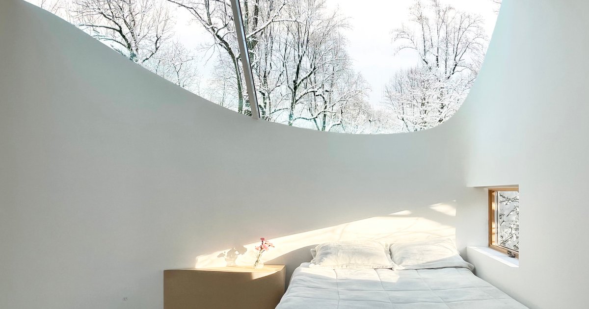 Stepping outside the old house, a glass floor leads into this skylit gap, designed as a version of the Japanese engawa. This outdoor space serves as a transition between the house’s interior and the surrounding nature, where trees emerge from concealed planters, much like the vine that once grew in the basement. The addition’s curved skylight creates an immersive experience, allowing residents to feel as though they are living within the canopy of the surrounding trees.