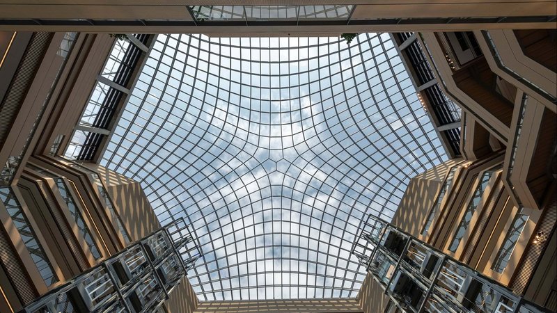 The building's facade has a strong horizontal emphasis, which is in keeping with the low-rise urban fabric of the surrounding area. The technical plant and building cores are incorporated into the cantilevered roof form, giving it a sleek profile. The geometry of the atrium roof is a form-found, glazed gridshell dome, which reflects the forces acting upon it and allows for thin, lightweight structural members. Daylight streams into the interior spaces, creating an uplifting, light-filled workplace. Each triple-glazed panel has been cold bent to create the building's striking glass dome.