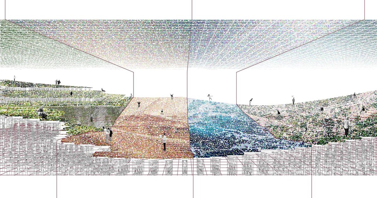 The second-floor perspective reveals a surreal landscape constructed from pixelated textures and atmospheric gradients. It resembles a topography of digital memory—part natural, part synthetic. Here, architecture no longer imitates nature; it constructs new natures using computational logic.