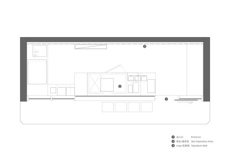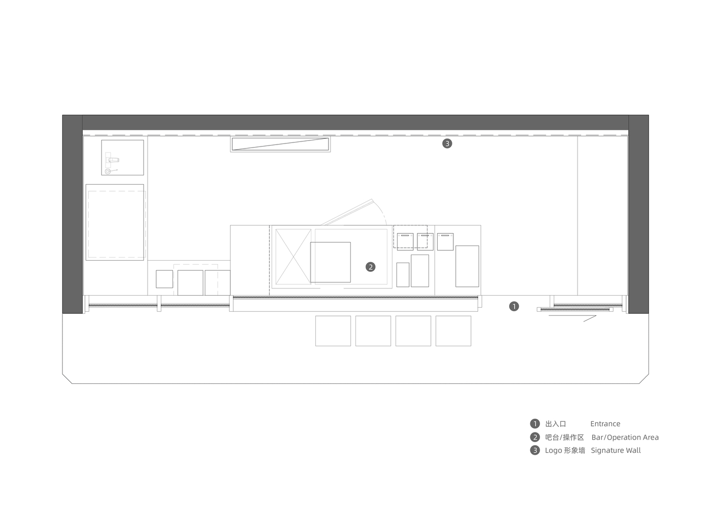 The primary challenge of the renovation was the coffee shop's minimal dimensions—5.3 meters in width and 1.8 meters in depth. To maximize the usability of this space, the design transcended traditional two-dimensional layouts. Instead, a three-dimensional approach was employed, utilizing a framework system that integrated facade language and suspension devices. This allowed for expanded temporary storage solutions and optimized the interior for various coffee-making processes.
