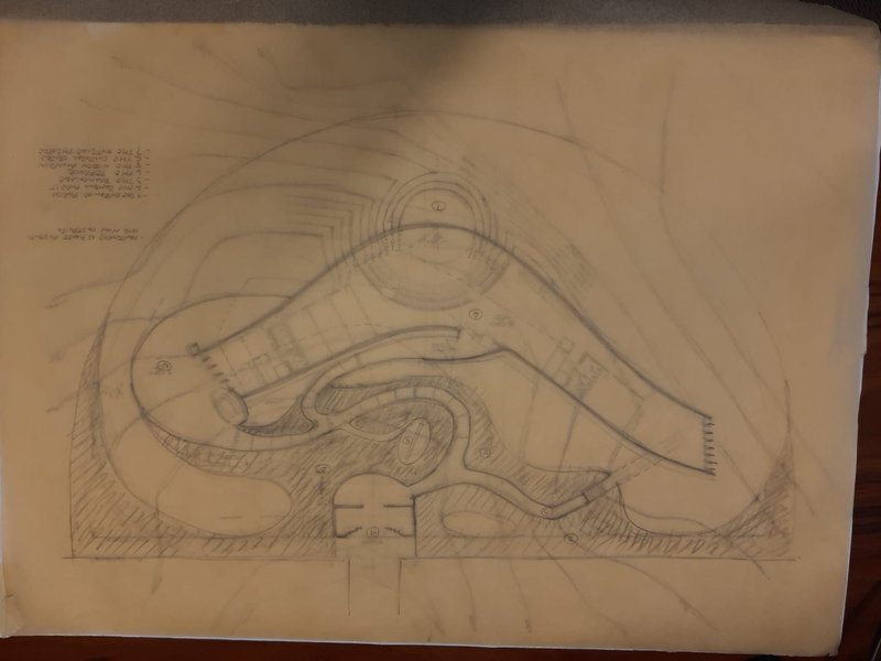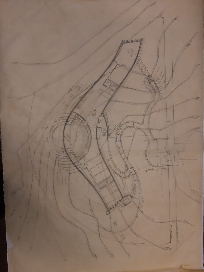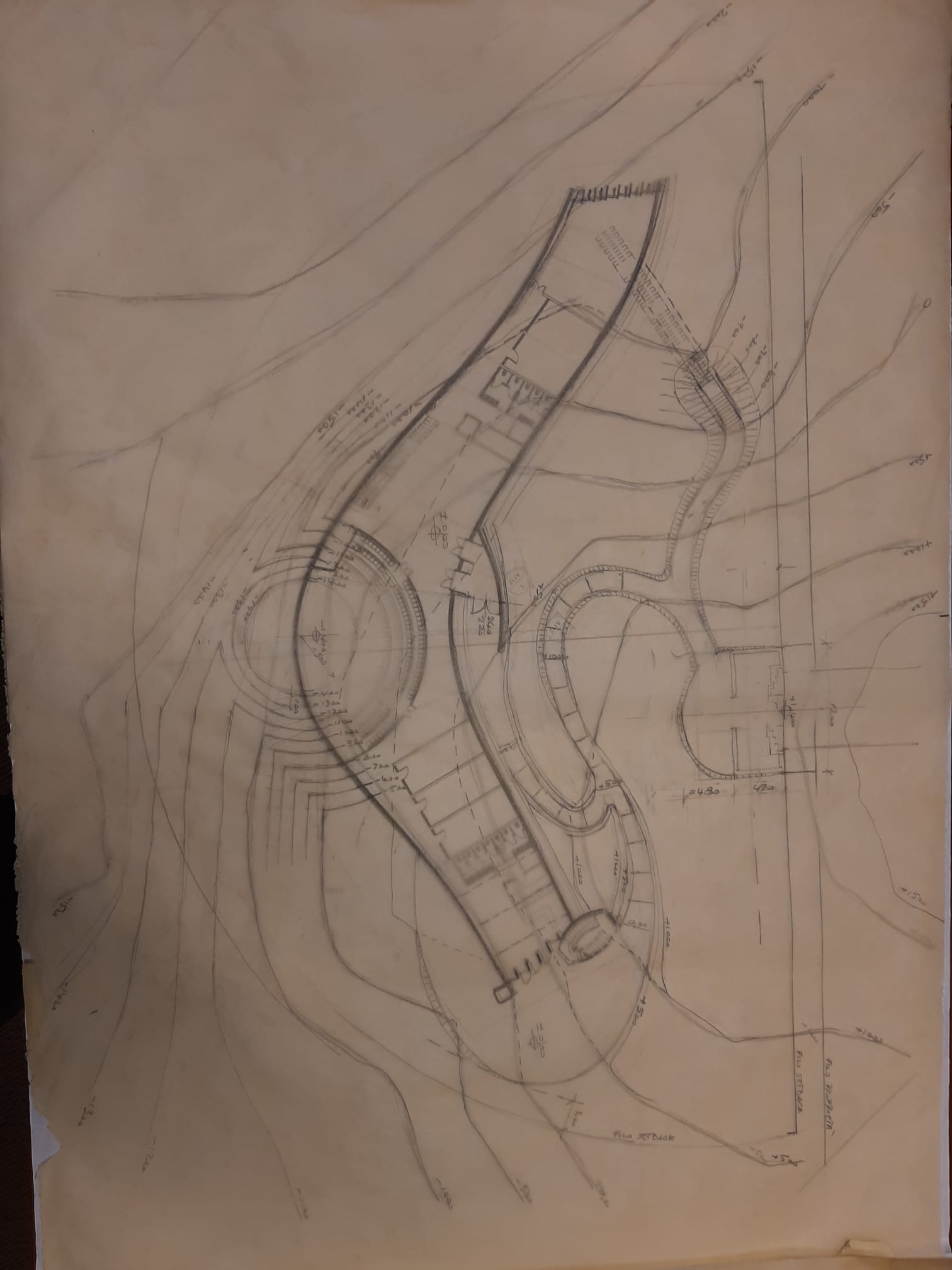 The entire building appears only when our visitor is very close to it. The dimension of the building that suddenly shows up strikes him. The first impression is strong, estranging and disorienting, the building looks like a huge dune with a sort of mouth that invites him to get in.