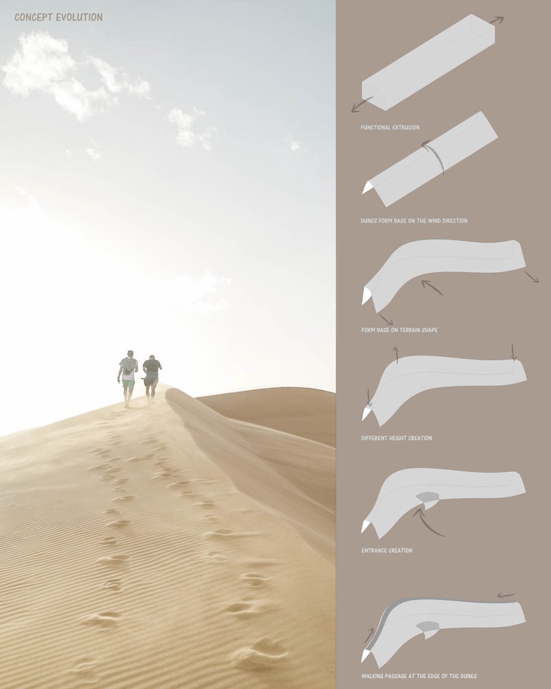 Looking from the lake the building becomes a sand wave over the lake, a strong reference point easily recognizable from the whole oasis area.