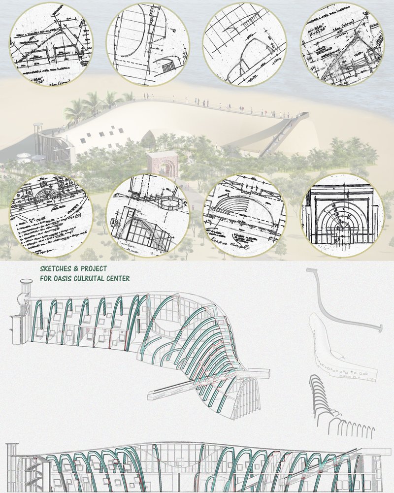 When we read the presentation of the competition and we looked at the pictures of the references and of the site, we did not think to a possible project but to a possible experience: the experience of visiting the Oasis Cultural Center.