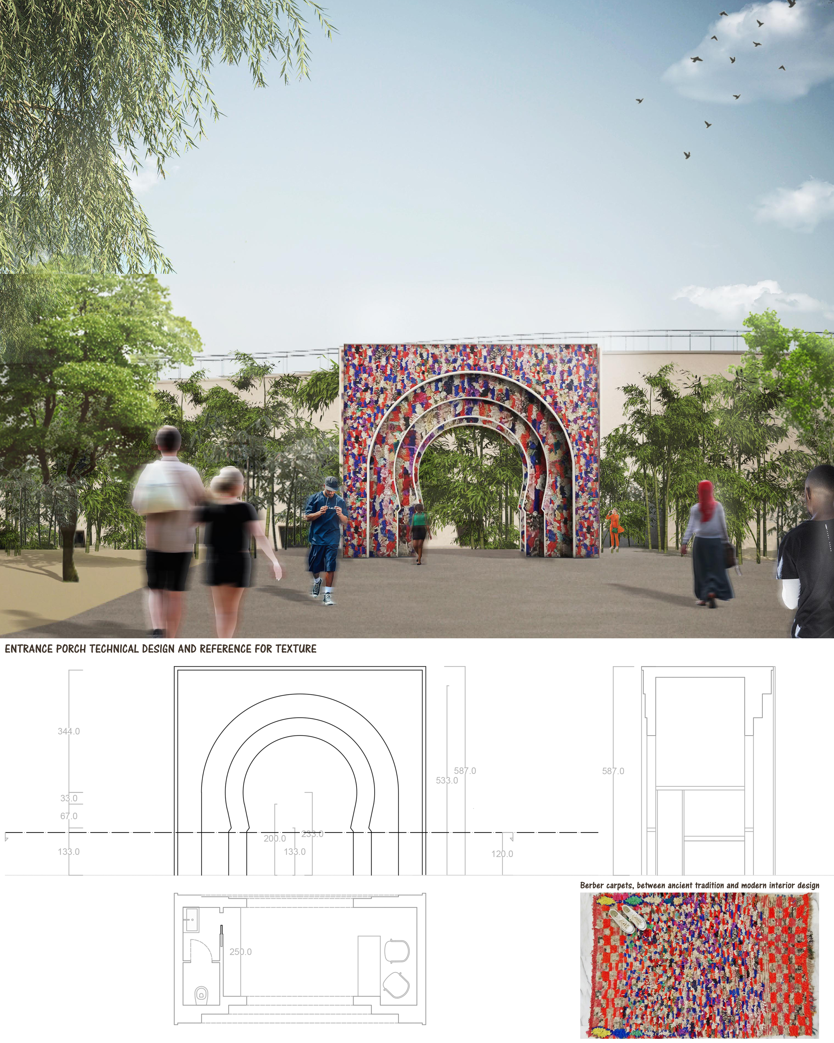 As this is a crossing point, here the necessary reference is what is consolidated in the collective architectural memory. Our main reference for the portal is Marrakech Bab Agnaou, that has a typical shape that invites to get in and actually welcomes people in what is still considered a “magical place”. We modified its façade to adapt it to the scale of our project. As the main goal of the Entrance Porch is creating a perceptive detachment from what is around it, we designed a skin whose reference are Berberian decorations, colorful and bright, and that gives a feeling of levity and smoothness while covering a structure that gives an idea of solidity. The Entrance Porch architectural concept is a contemporary reinterpretation of the architecture of the past but most important are the feelings that arise while going through it.