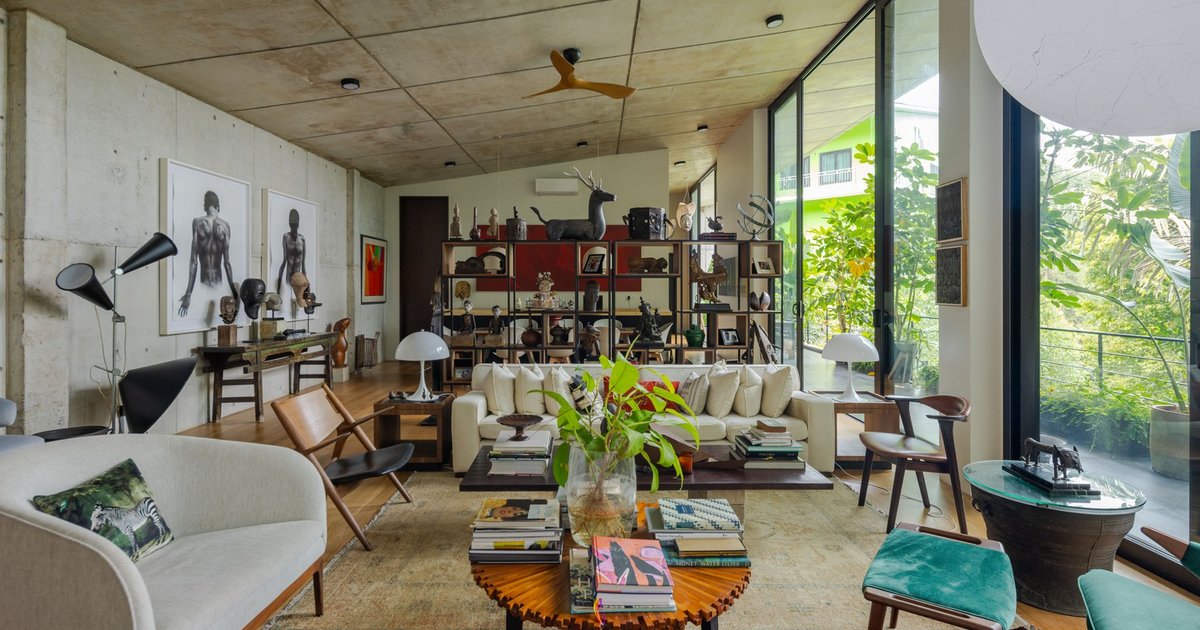 True to its owner’s identity, The Rainforest Residence doubles as a gallery and a dwelling. The windowless main façade creates uninterrupted walls for large-scale art installations, including striking charcoal pieces that define the home’s visual rhythm. Inside, curated objects—paintings, masks, sculptures, and ancient artifacts—populate the interiors, creating a rich tapestry of cultural narratives.