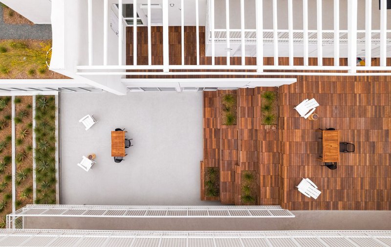 The architectural concept draws inspiration from Southern California’s historic courtyard housing, notably Horatio Court (1919) by Irving Gill. Rather than placing residual outdoor space around the building perimeter, The Rose Apartments organizes life around a raised central courtyard positioned above ground-level commercial space. This elevated courtyard acts as a semi-public social heart—mediating between private living spaces and the surrounding neighborhood.