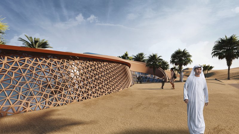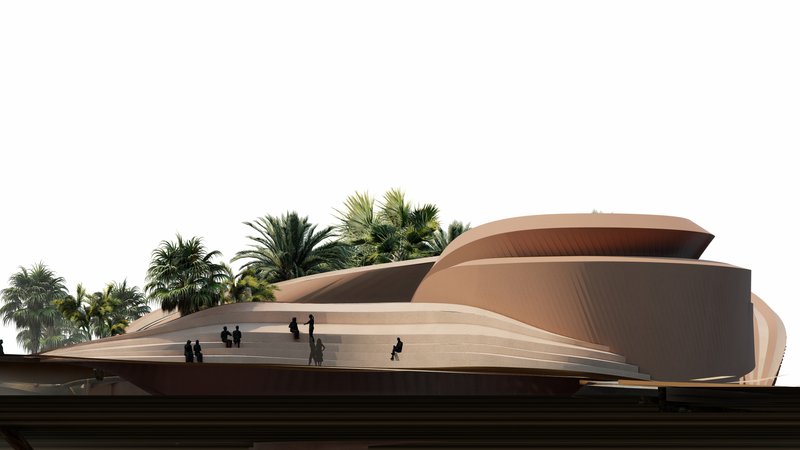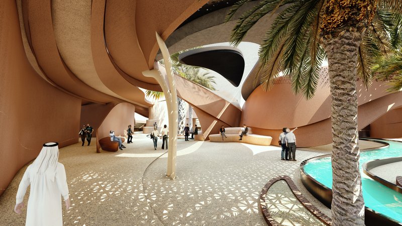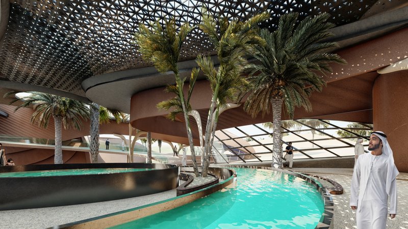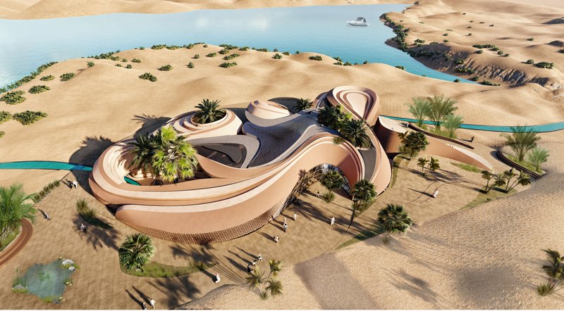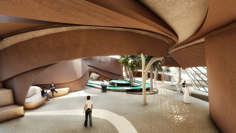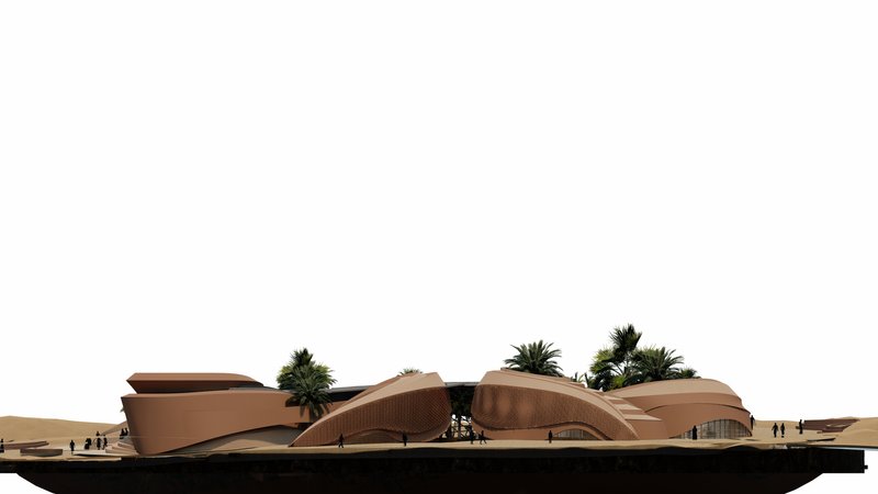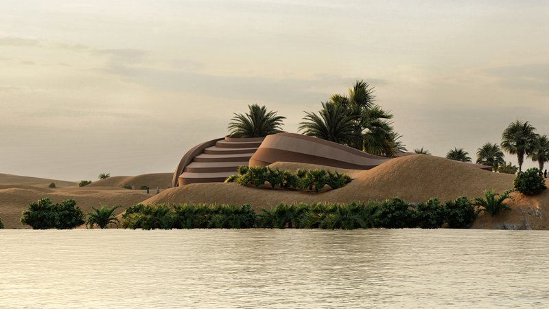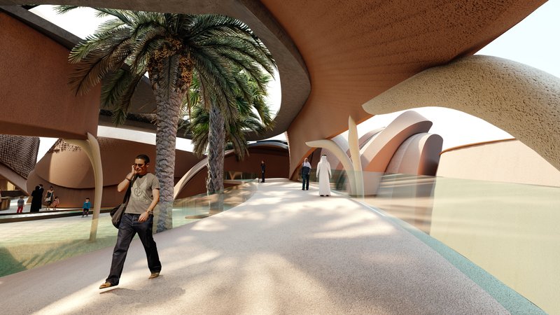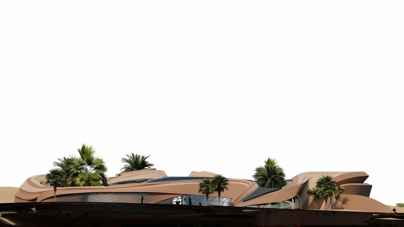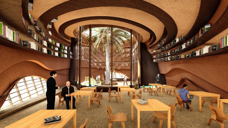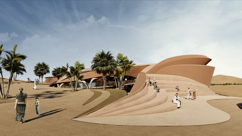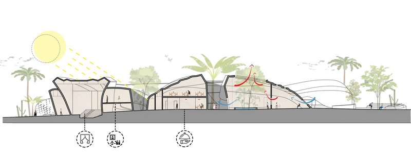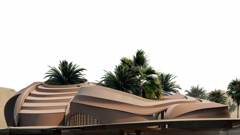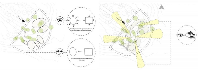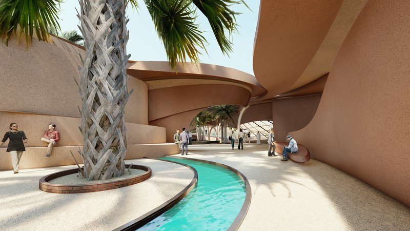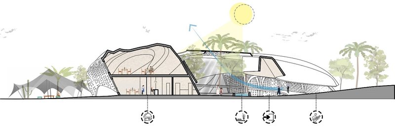 The volumes are in an introverted arrangement in coordination with the surrounding site and modeled on the oasis in which the project is located to create comfortable conditions in the harsh climate of this region and to create a favorable climate. Water flow was added to the building as one of the most essential factors in forming oases. Moreover, more favorable thermal conditions were created with the establishment of volumes at a level below ground level and with the help of existing topography. Grid shells were used in the façade to deal with heat and intense sunlight. The patterns used in these shells are inspired by traditional Moroccan architectural patterns.