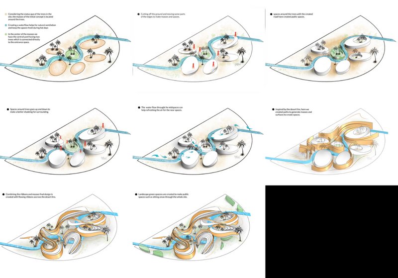 Several basic concepts were designed by studying the project context, including the climatic, cultural context, etc. Then, these initial designs were evaluated according to environmental, economic and indigenous, social and cultural criteria, responsive construction methods and architecture, and the concept that was most compatible with the design context was selected. The selected concept was further upgraded to achieve the design goals and criteria during several stages. These steps include improving the performance of spaces and communication with the site, optimizing airflow, daylight, and energy.