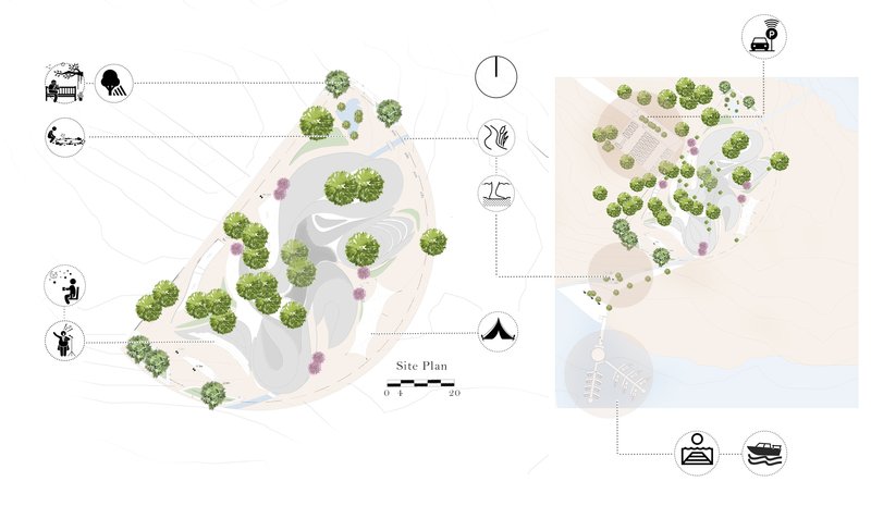 Upgrading vegetation to improve comfort conditions was one of the points considered in the design. Accordingly, it was possible to enjoy the view and landscape in all seasons by using the proposed trees such as Argan and Jujube tree for planting on the site and shading the trees on the designed platforms. Cool airflow and the possibility of using this space became possible in the hot season in the southern part of the site by designing wicker walls in the desired wind direction and moistening them. Also, a place was designed for users of the site to relax at all hours of the day by placing black tents suitable for hot and semi-humid climates.