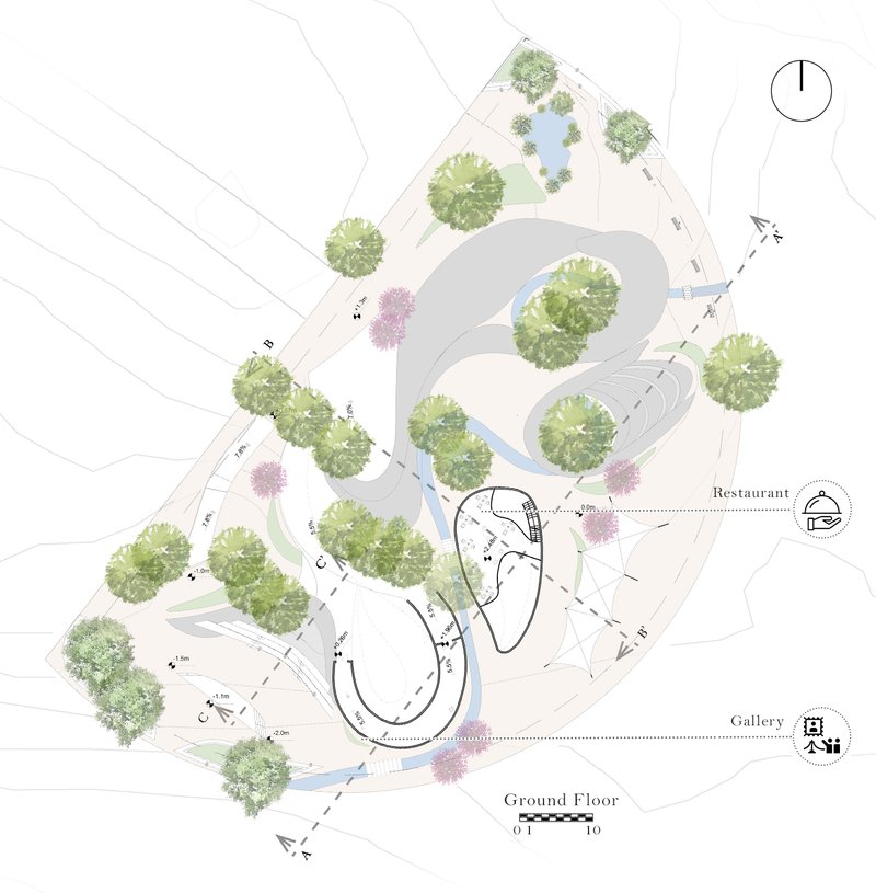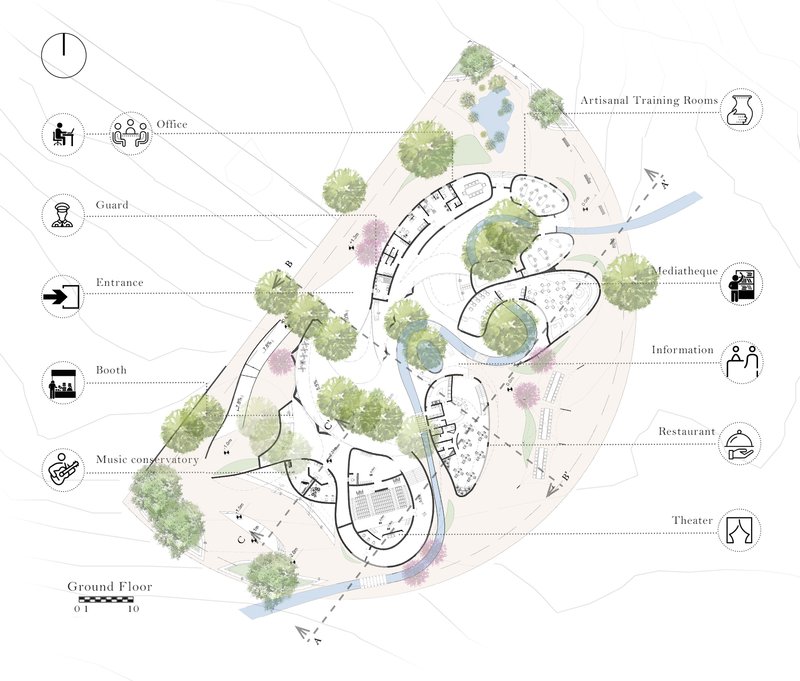 The organic texture model of Moroccan cities is the initial idea of this project. Therefore, the overall structure of the plan consists of several smaller volumes to perverse the trees on the site and pay attention to the communication paths and wind direction. This structure has taken a form in harmony with the sand in combination with the nature around the site.