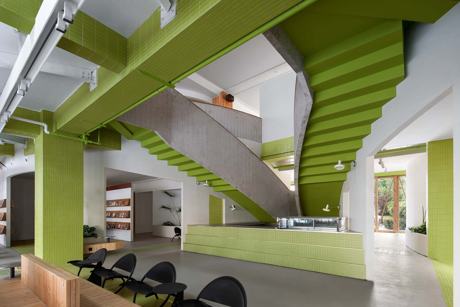 - Second Floor Adaptation: The former central roof garden was transformed into a double-volume exhibition hall under a newly designed roof that channels indirect daylight while connecting vertically to the first floor.
