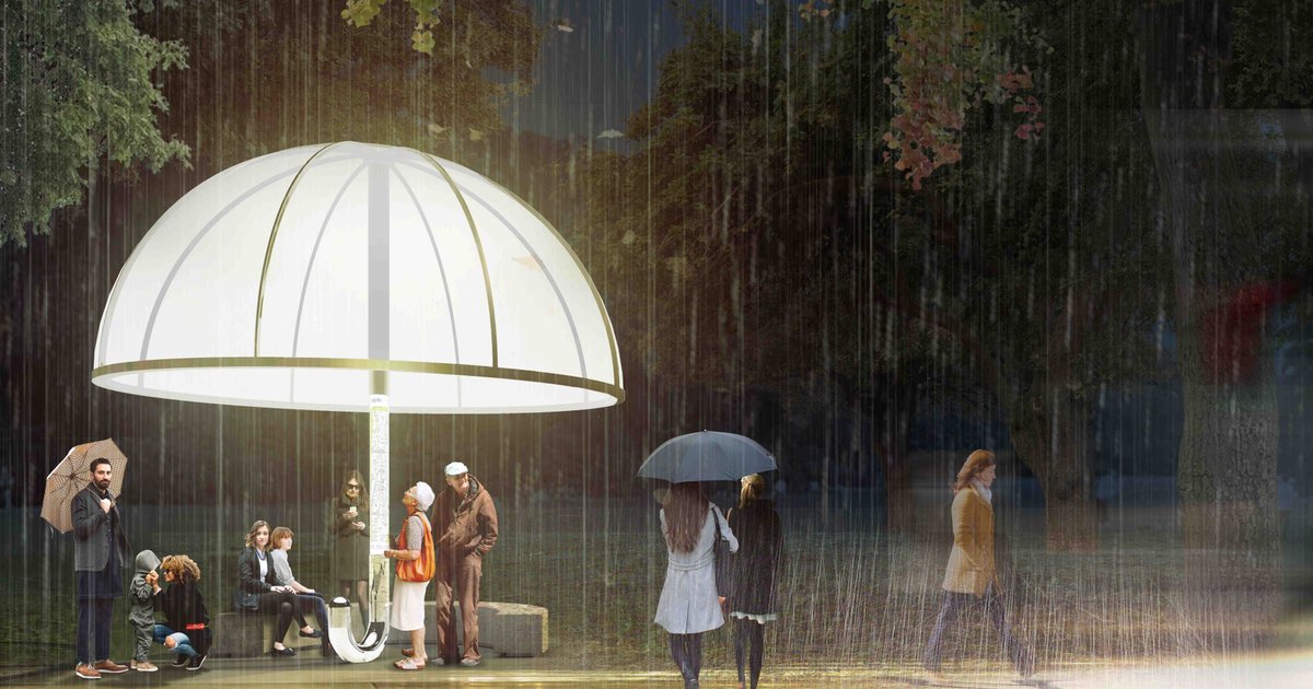 Even when not illuminated, the bright and shiny structure is clearly visible against the dark tarmac of the street or the green brown colouring of the park. In the evening or at night the crown of light, hidden in the umbrellas brim illuminates the inner dome of the hemisphere, bathing people standing underneath in a warm, pleasant light. The rather rough and natural exposed concrete of the bench contrasts on purpose with the umbrella. It’s chosen materials where inspired by the product design side of the Bauhaus. The “Umbrella Baus-stop” can be seen and produced like a product.
