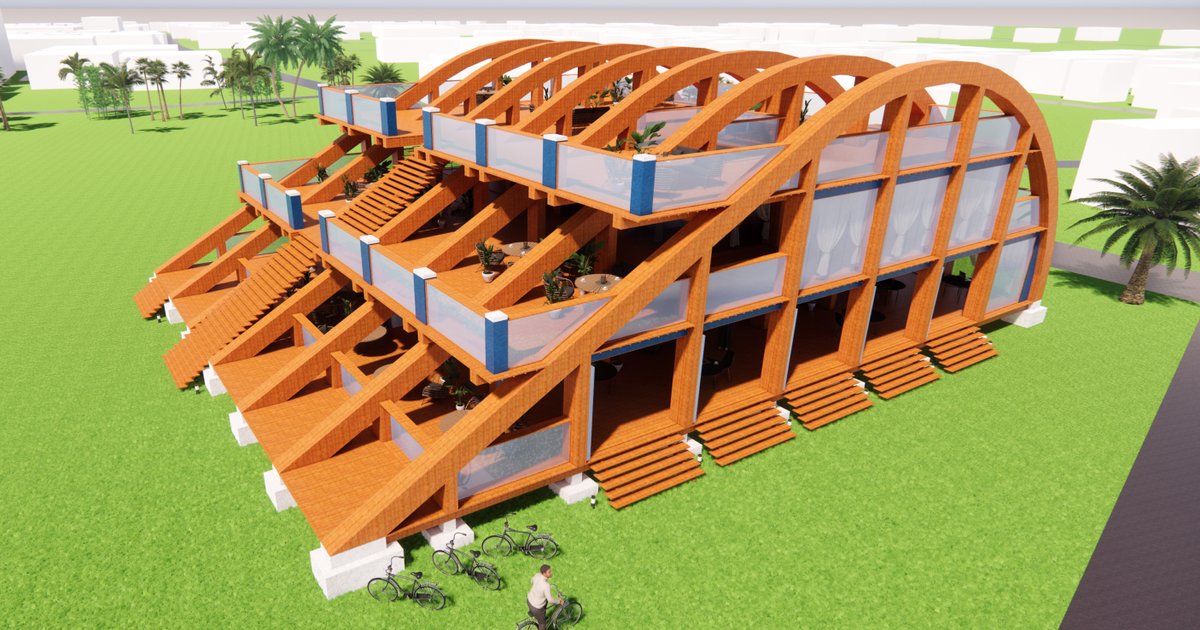 Cross-laminated bamboo is the main material of this building. Bamboo is largely cultivated in Bali, bringing the local and natural feeling to the café. This somewhat novel construction material is one of the answers to a more sustainable future of built environment. Treated bamboo fibre makes not only strong, but also weather-proof façade with minimum maintenance, allowing the building to preserve its appeal over time. By introducing this material, The Wave brings together the beauty of two contrasting elements; the lively water and the sturdy wood.