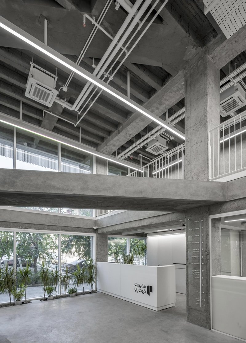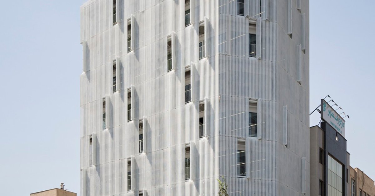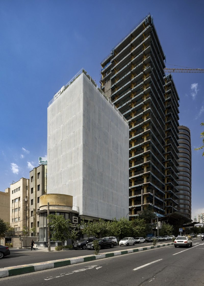 Nestled between dense urban facades along one of Tehran’s busiest streets, the original structure faced challenges typical of aging office buildings in crowded city centers. Instead of opting for demolition, which would produce significant environmental impact through waste and emissions, Olgooco chose to renovate and rejuvenate the existing building. The design wraps the structure in a sleek white façade, or "white veil," that masks the aged concrete frame while highlighting the contrast between the old and new. This façade acts as a modern protective shell that revitalizes the building’s identity and presence in the cityscape.