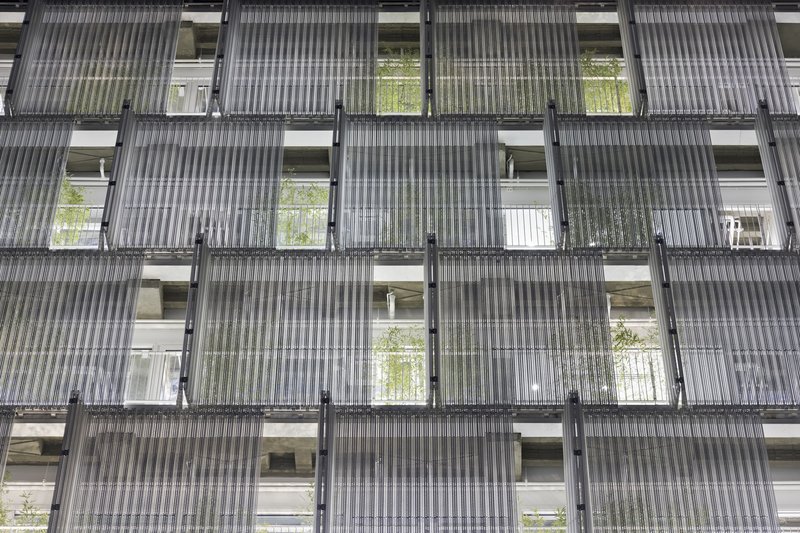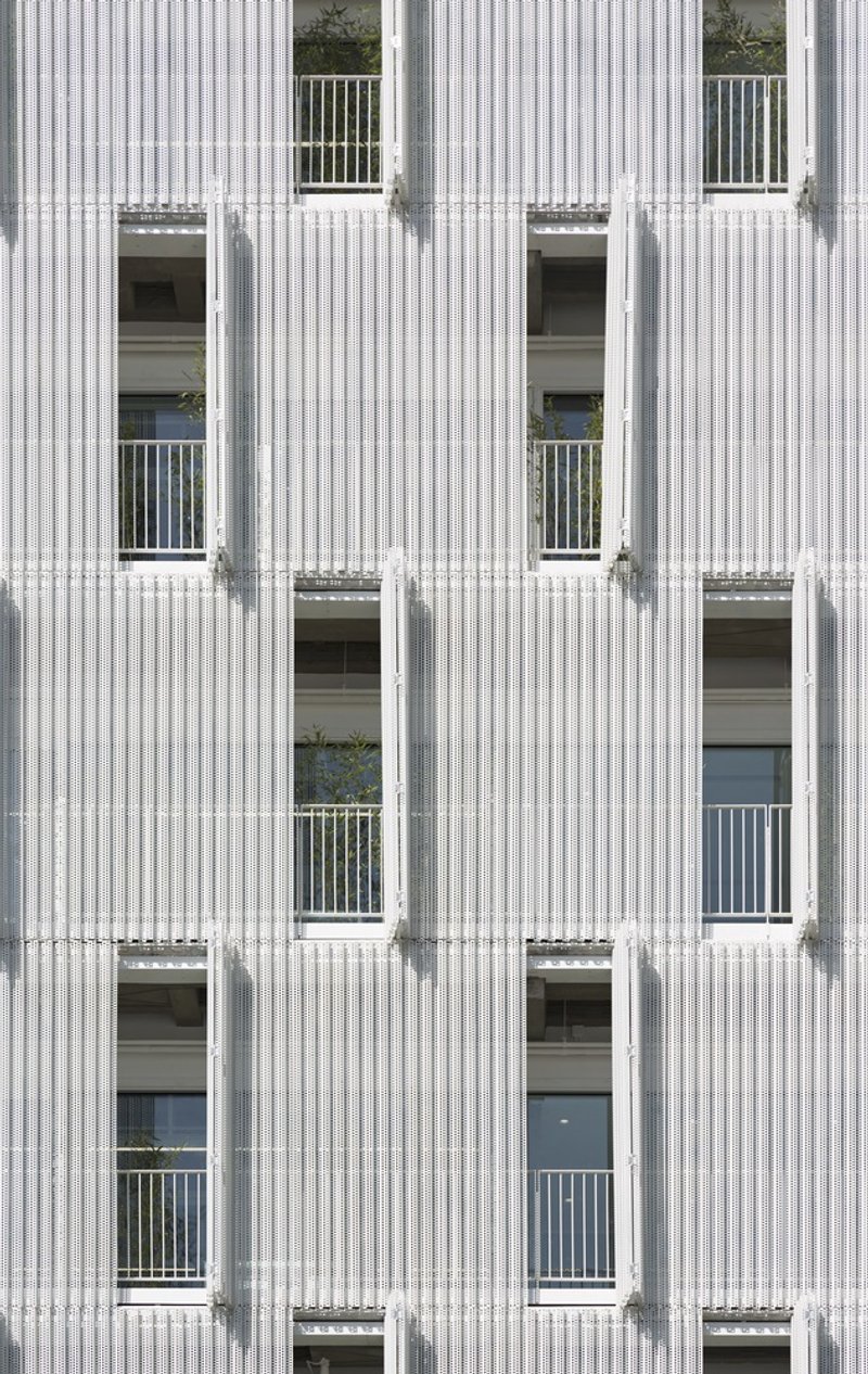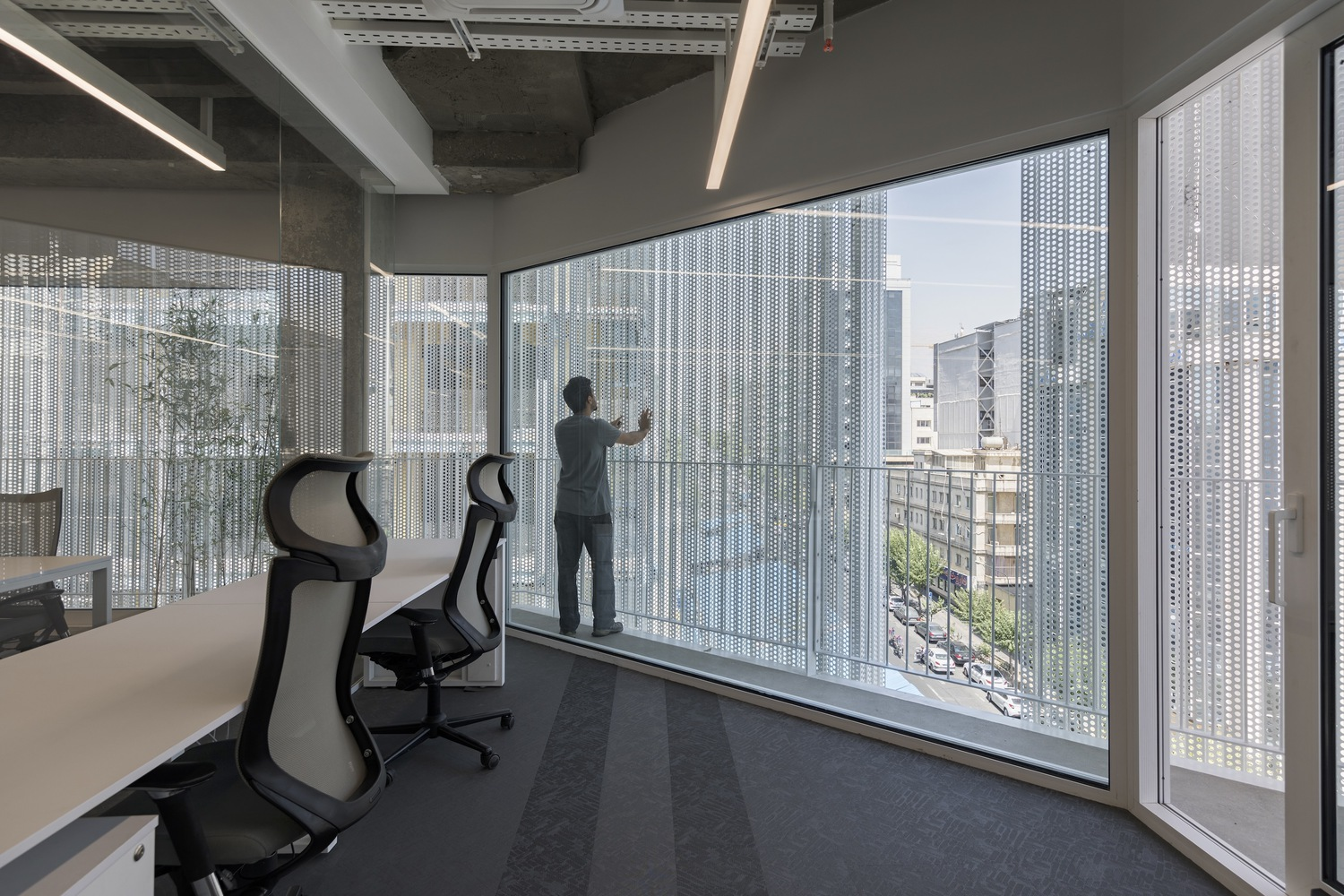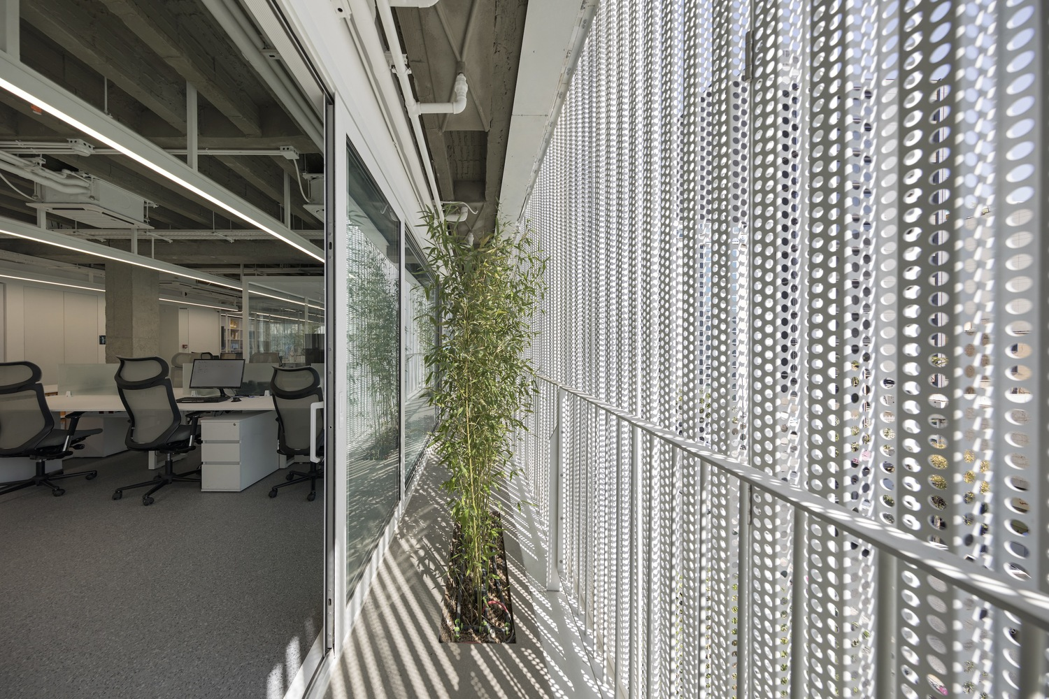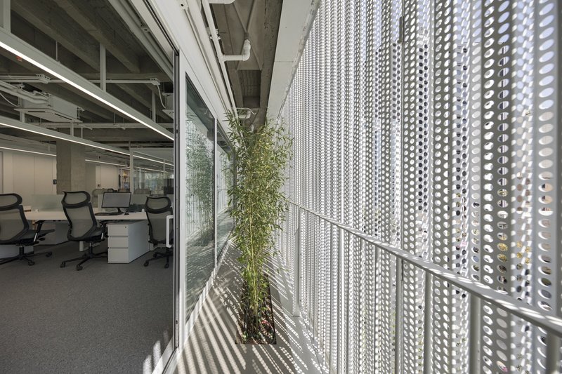 Inside, the building’s design prioritizes user comfort and environmental performance. Recognizing that external views are constrained by the increasingly dense surroundings, the architects introduced a second mobile perforated aluminum shell along the interior side of the façade. This dynamic layer serves multiple functions: