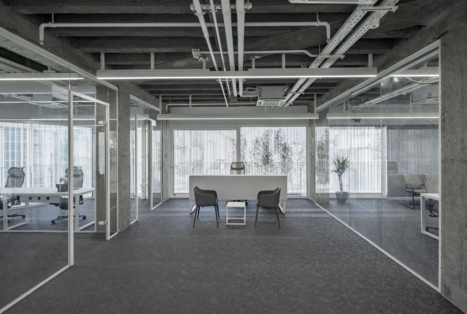The corridor between these shells, adorned with lush bamboo plants, forms a unique micro courtyard that brings nature indoors, improving office ambience and air quality.