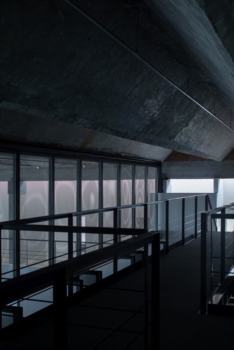 The original structure featured concrete columns on the east and west, supporting a folded concrete roof that allowed a column-free interior space. Before renovation, the building combined a mezzanine on the southern side with open-plan office areas. Jin Qiuye Studio approached the renovation with the philosophy of “Neither New nor Old,” preserving authentic surfaces where possible while enhancing the building’s spatial and material beauty. Different treatment methods were applied to each section, allowing materials to age naturally and harmoniously.