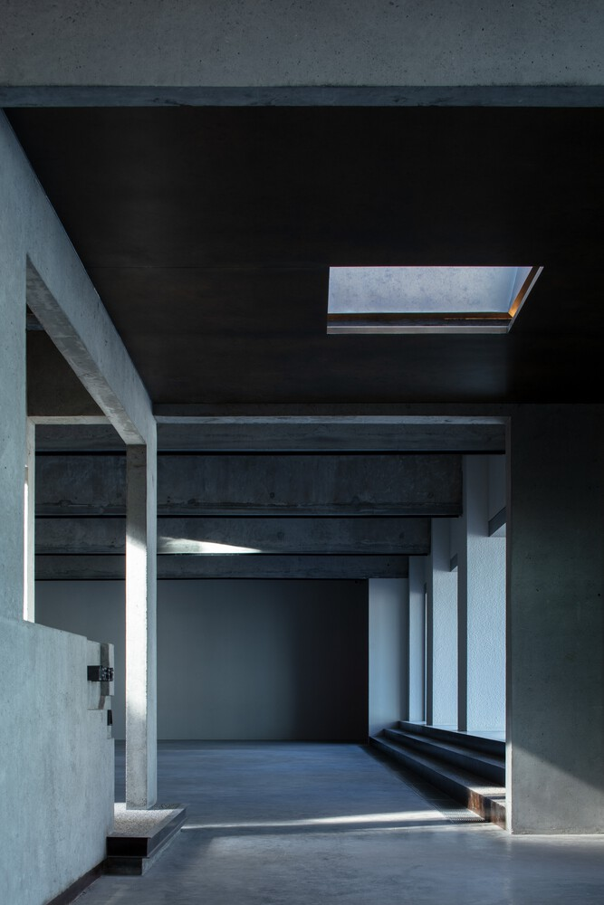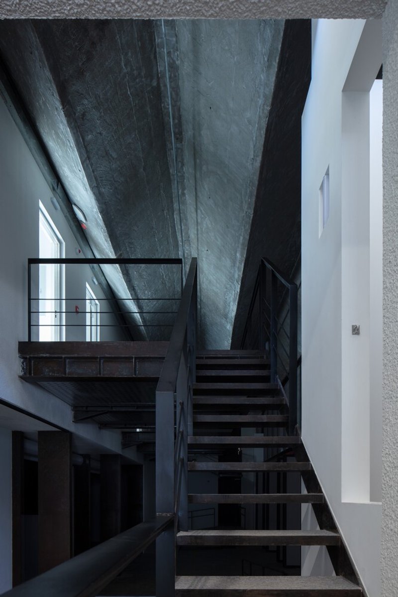 The renovation emphasizes material authenticity and sustainable reuse. Steel beams and columns from the original structure were retained, circular ceiling panel openings were added for natural light, and leftover materials were collected for future use. A small staircase enclosure utilizes a framework of H-beams, square steel, and polycarbonate panels, exemplifying the project’s attention to detail and resource efficiency.
