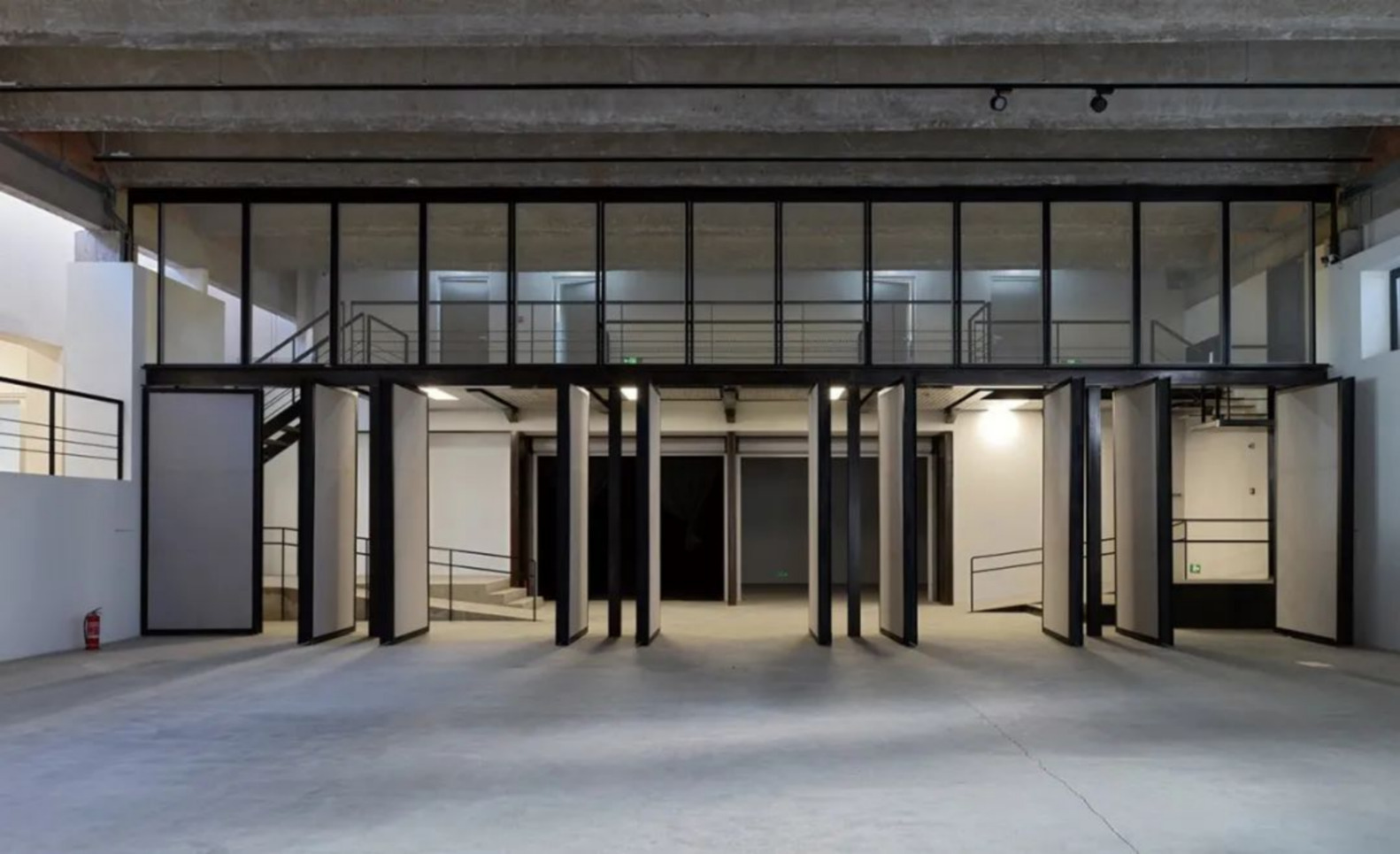 The architect’s personal residence is strategically located in the southeast corner, connected to the mezzanine via a steel staircase that integrates seamlessly into the gallery flow.