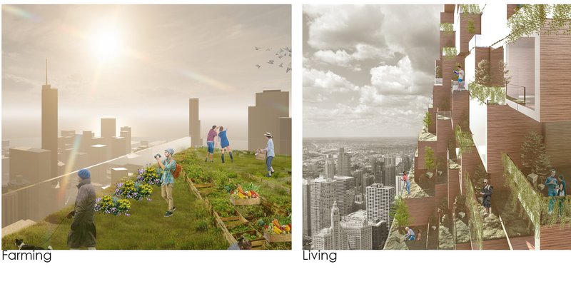 As the building rises, a flowing movement appears, to offer a smooth transition from semi-public multiuse, to private living. The tower is gradually stepping back, to provide individual balconies and common spaces on every floor. In that way, residents will have their own nested green balcony, but also, they can gather for activities and leisure at the green shared spaces each floor provides. The twisting culminates at the top of the tower, revealing the indoor greenhouse and the roof urban gardens. The roof top is 280 m. height. That makes it the bigger and the higher green roof in Chicago. The top end can also be used as an observatory, small event venue and urban farming gardens, combining community, landscape and sustainability.