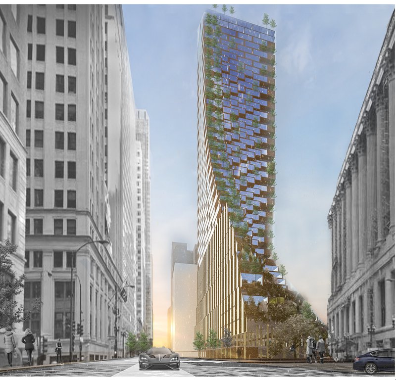 The parameters varying throughout the building’s height, depth, screen density and planting types. The green façade creates a healthy urban environment, with plants and trees from the local landscape, creating a collection of species in the center of Chicago, where everyone can see them up close and learn about each species. The planting rises up, winding from street level to the top, while is punctuated with public seats that offer opportunities for rest amongst gardens.