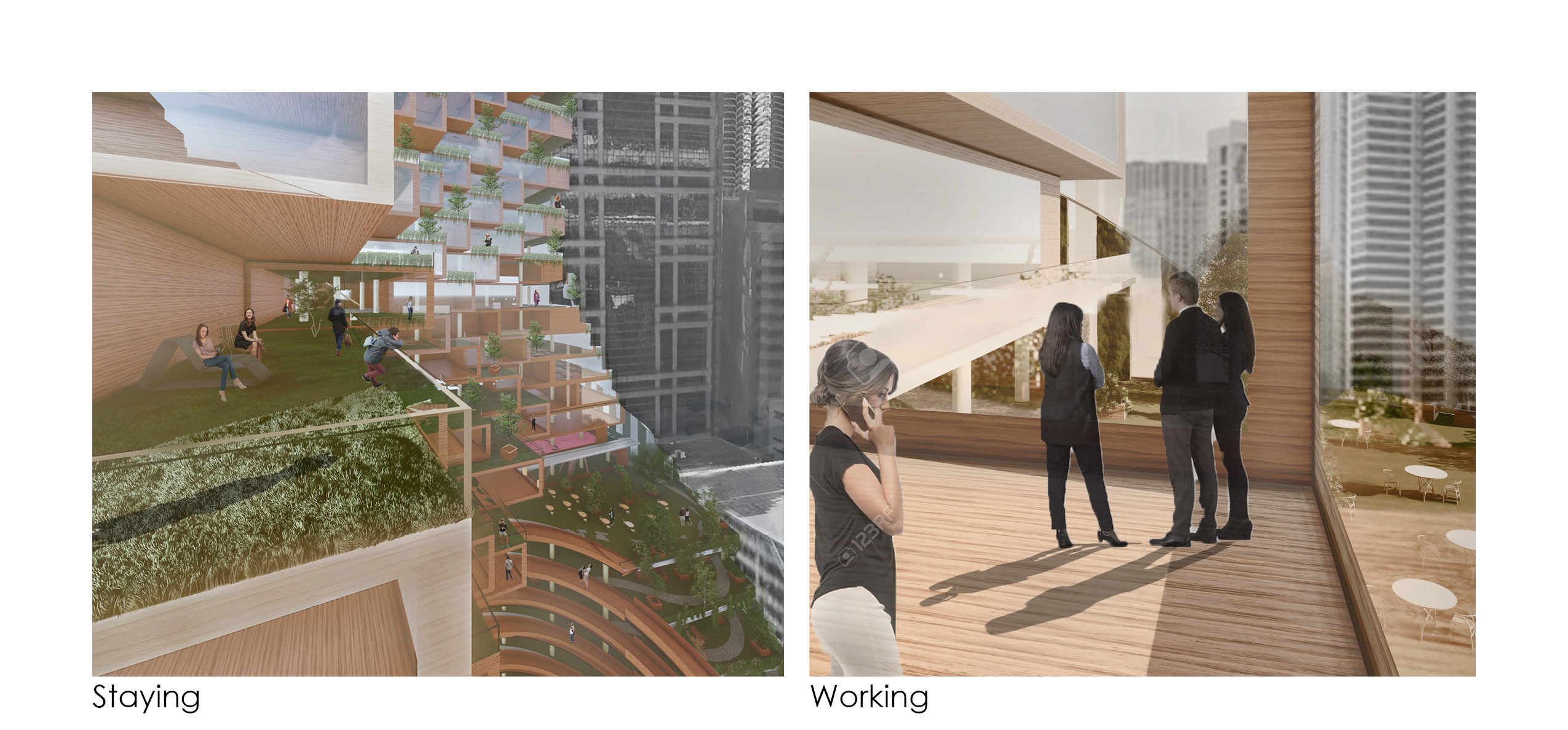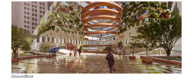 The public space, is a permeable open space that invites both visitors and residents. The retail spaces have their own unique access to balconies and terraces, allowing shoppers and visitors to engage with an environment that differs from that of typical retail mall or street. At lower levels, the tower directly engages with the old Thompson Centre by bringing people up thereby expanding the public realm up and into the building. The connection from ground level unfolds through stairs and platforms, leading the visitors up along the retail and entertainment facilities.