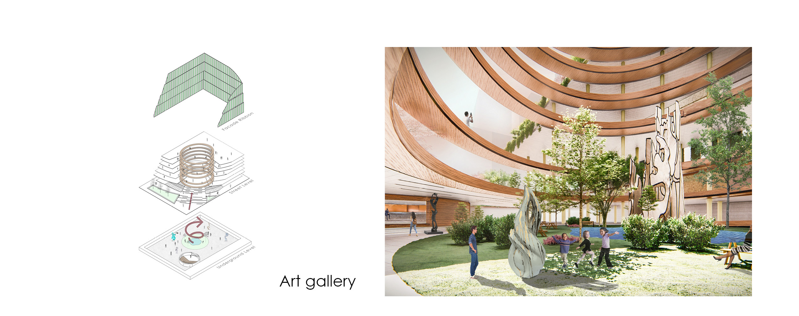 At the front entrance of the center, there is a sculpture, made by the French artist Jean Dubuffet, and it implies that this building houses a tremendous art collection. Its collection includes nineteen specially commissioned artworks funded by the State of Illinois Art-in-Architecture Program. In order to not only keep, but also revive this heritage, the sculpture moved to down to the center’s core, near the auditorium which now can support various events and play part in the exhibitions the open underground floor would host. A wooden spiral structure ramp connects all public levels, creating a sloping vertical tour around the public jungle, letting pedestrians admire plenty of art pieces than are scattered along the route, among nature.