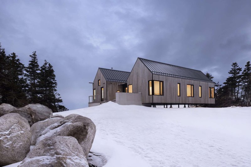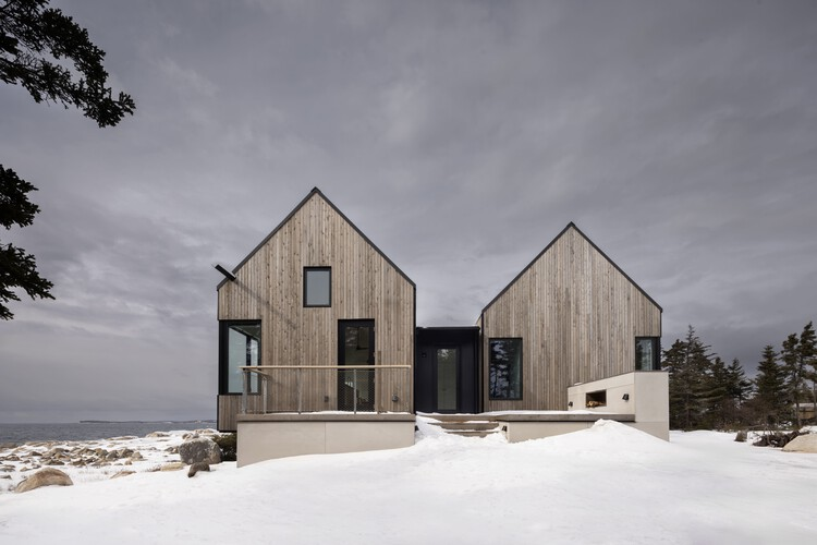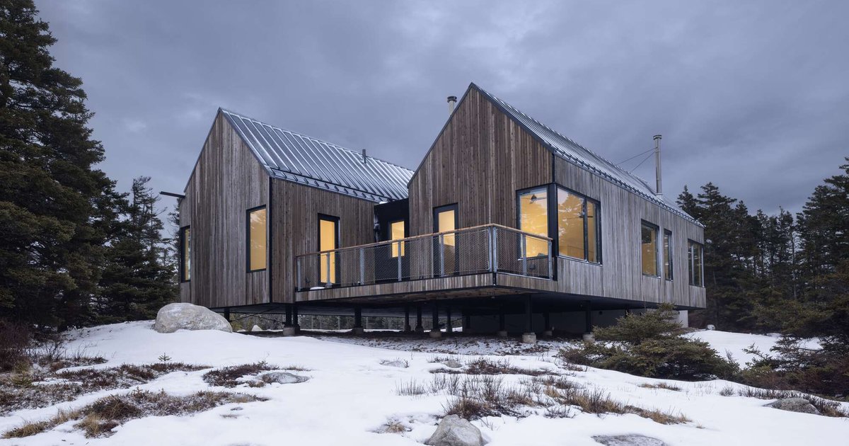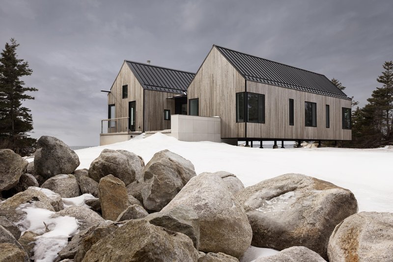 Sitting along Nova Scotia’s dramatic shoreline, the house features two bold gabled volumes that echo the region’s maritime heritage. The design responds directly to the site's geology and frequent severe weather. Elevating the home on stilts was a crucial architectural strategy, allowing storm surges and violent ocean waves to pass underneath without compromising structural safety.