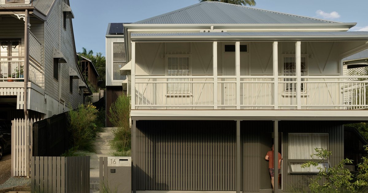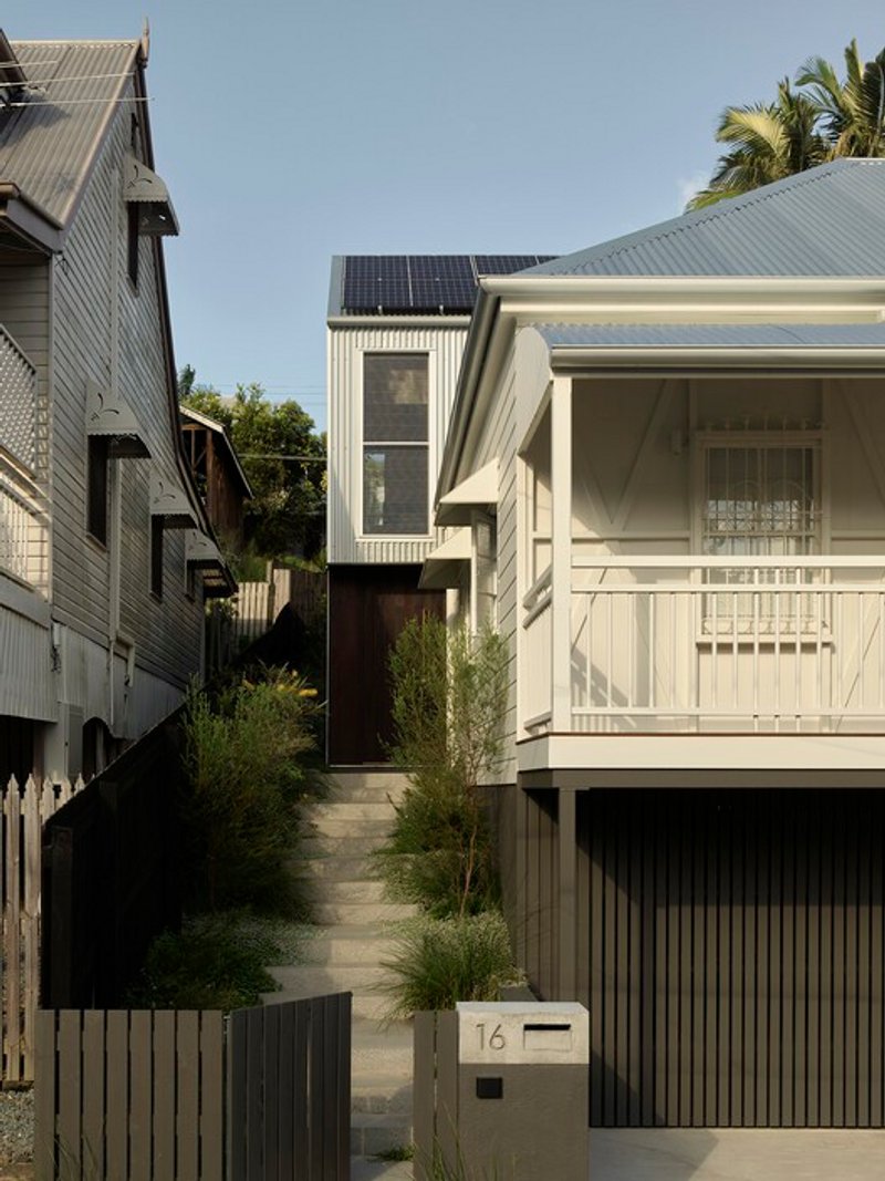 Restored Brisbane workers' cottage with contemporary vertical addition maximizing compact steep site through triple-height stairwell, passive design, and material honesty.
