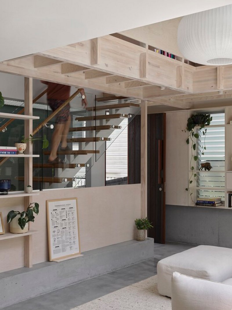 Interior materials emphasize natural textures and honest expression. Timber appears throughout—in flooring, joinery, stair treads, and wall linings—bringing warmth and tactility that softens the geometry's rigor. The timber will patina over time, developing character that reflects the family's occupation and care.