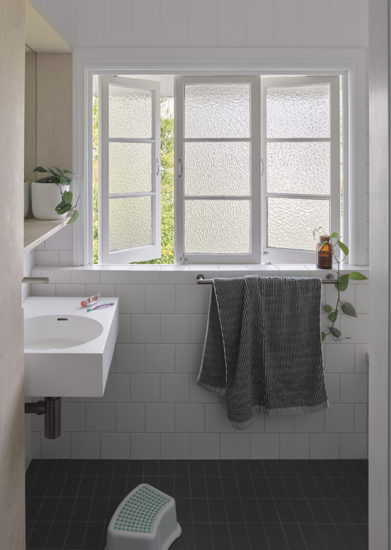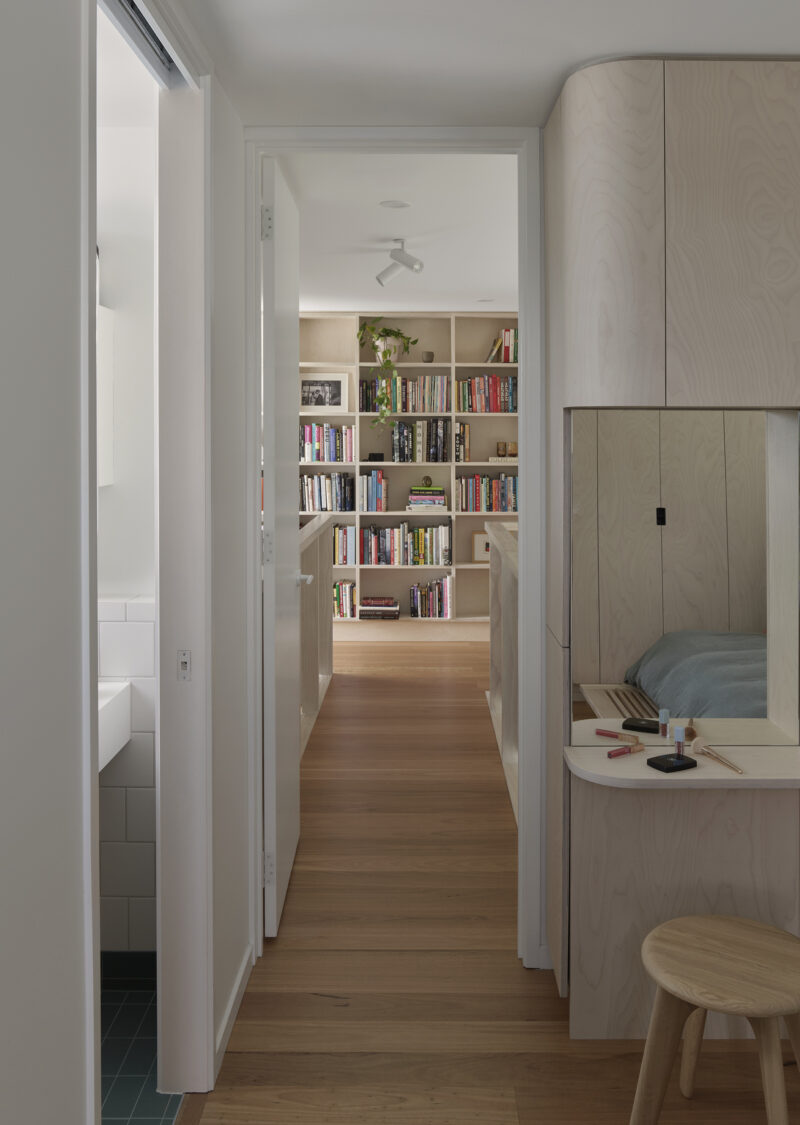 Throughout Tighty Whitey House, custom joinery performs crucial roles in creating spatial generosity within tight dimensions. Built-in elements maximize storage capacity while maintaining clean lines and uncluttered surfaces. Every shelf, drawer, and cupboard reflects careful consideration of the family's actual possessions and daily routines.