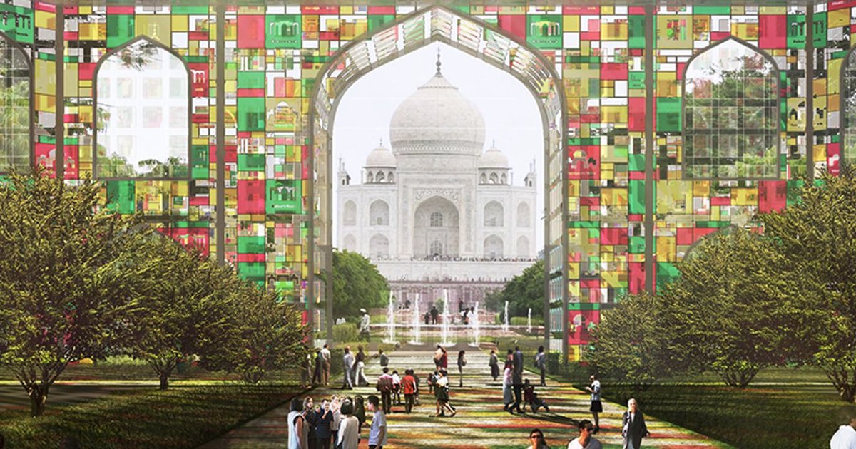 The shell of the pavilion is composed of reflective glass panels arranged in a structural grid. Each glass module acts as a “pixel” of time — collectively forming an ever-changing façade that reacts to light, weather, and the visitor’s position. In the day, the box mirrors the lush Mughal gardens and the white marble of the Taj Mahal, creating a dynamic interplay between nature, monument, and perception. At night, the reflections fade, revealing the colorful internal panels that reference Mughal silhouettes and restoration patterns.