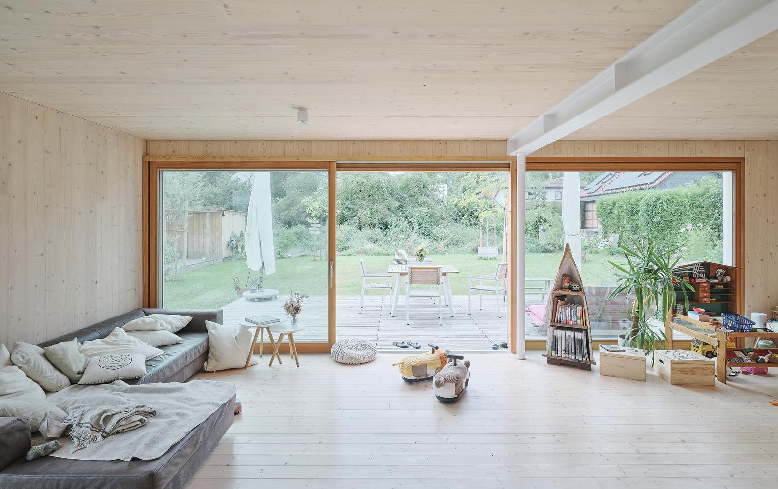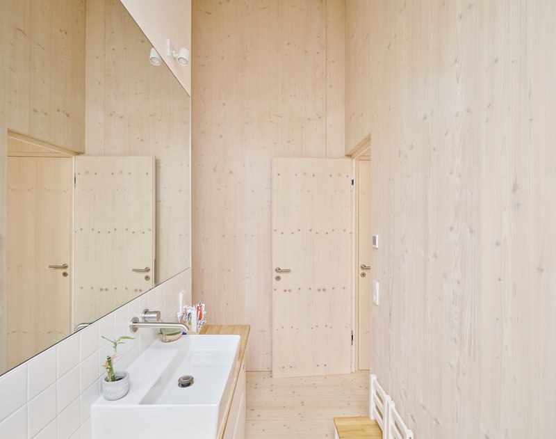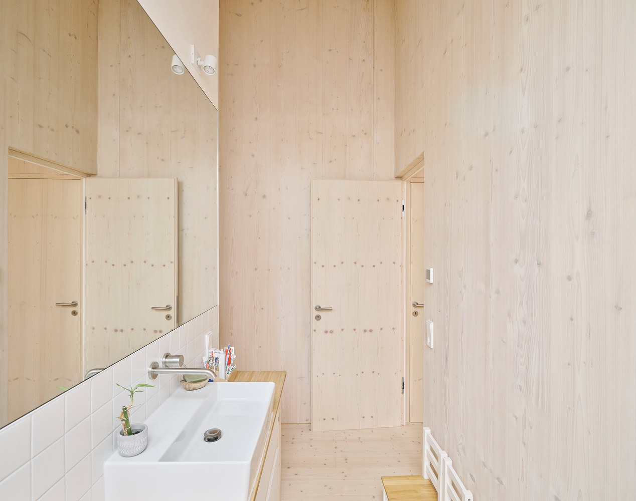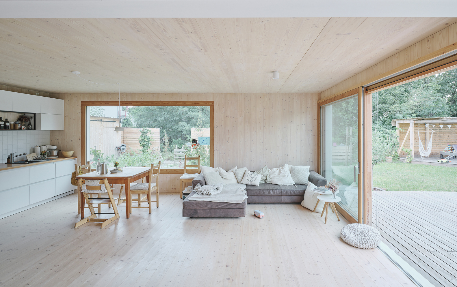 The filigree design of the 10 cm thick solid wood walls, without inner paneling, allows a 7% reduction in overall construction size, minimizing the use of climate-damaging composite materials. Except for the exterior plaster, the house is fully dismantlable, enabling all components to return to the raw material cycle. The interior roof is lined with clay panels, which regulate humidity and maintain a comfortable living environment throughout the year.