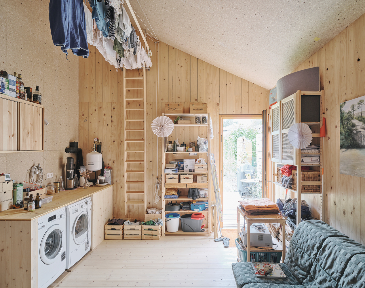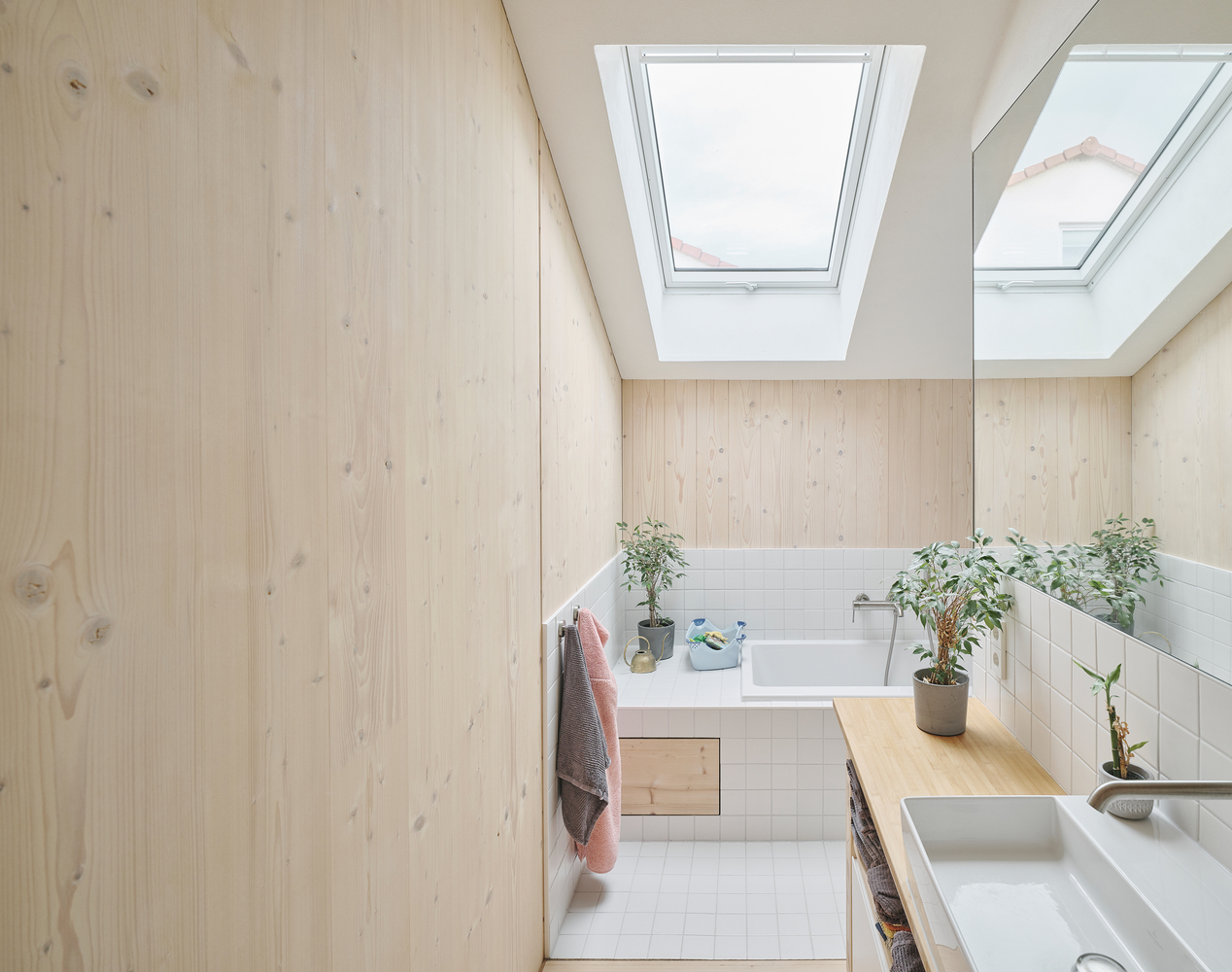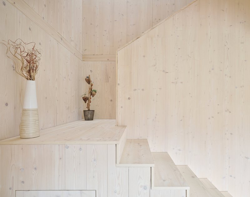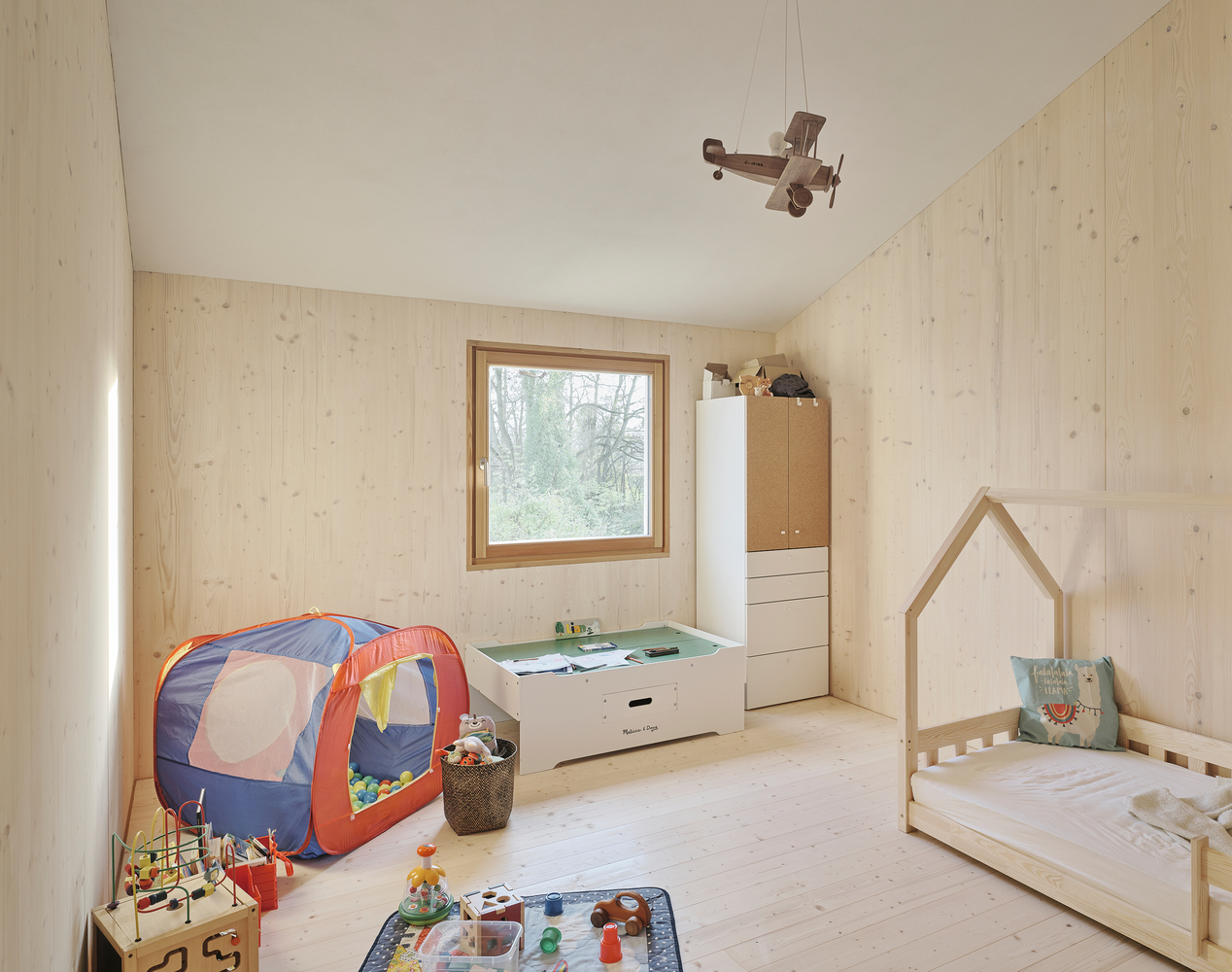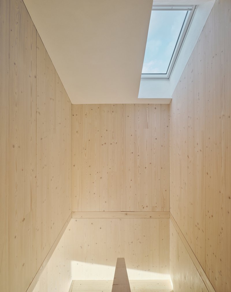 The filigree design of the 10 cm thick solid wood walls, without inner paneling, allows a 7% reduction in overall construction size, minimizing the use of climate-damaging composite materials. Except for the exterior plaster, the house is fully dismantlable, enabling all components to return to the raw material cycle. The interior roof is lined with clay panels, which regulate humidity and maintain a comfortable living environment throughout the year.