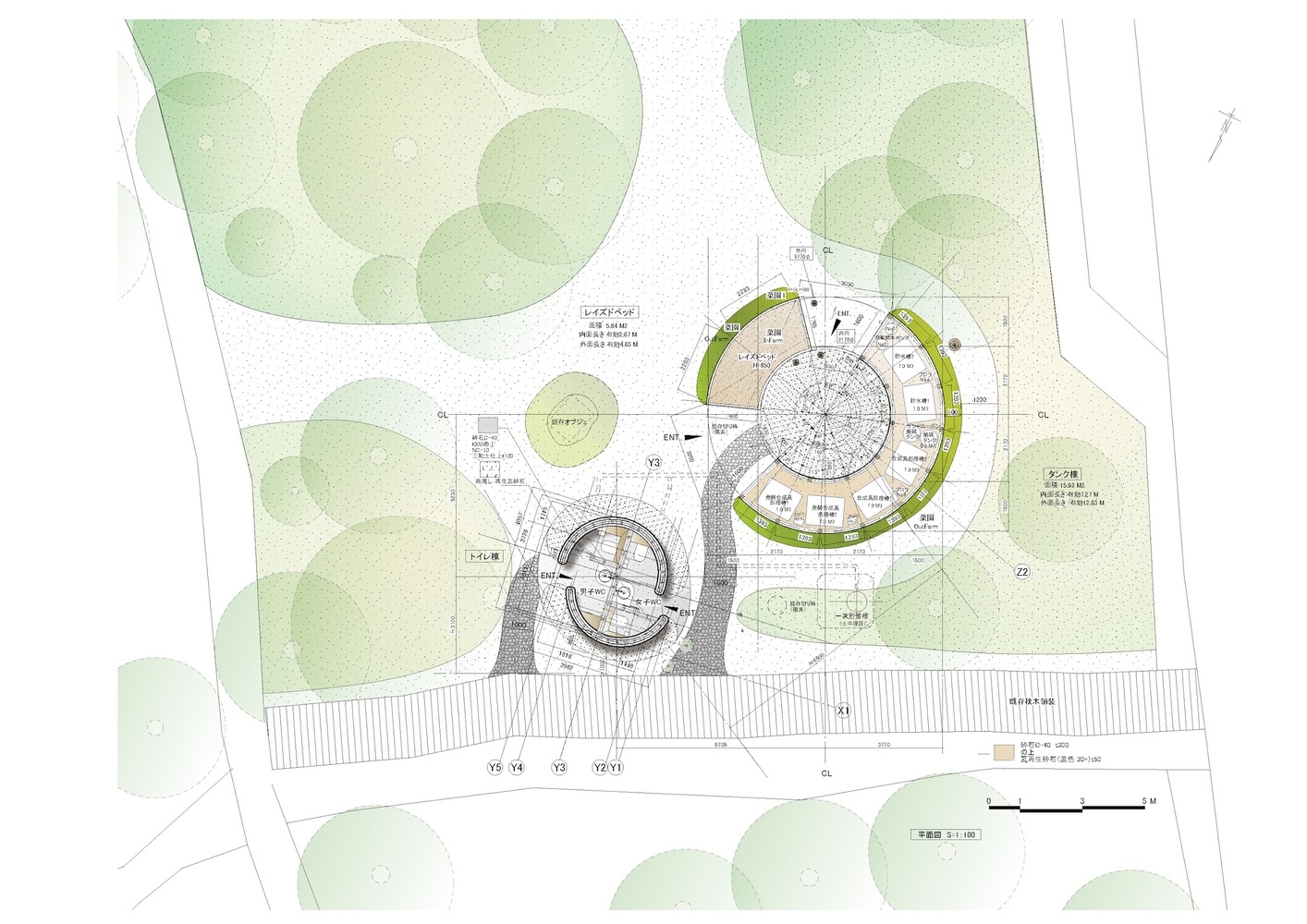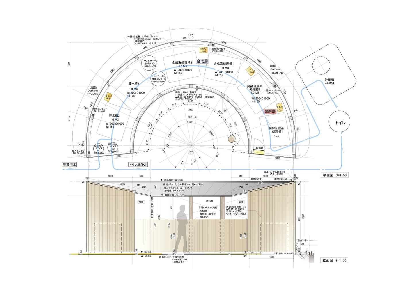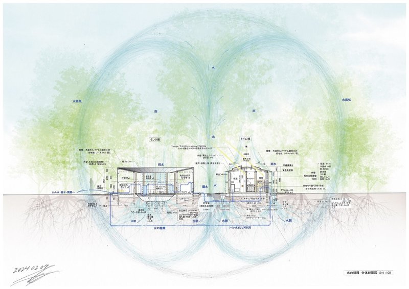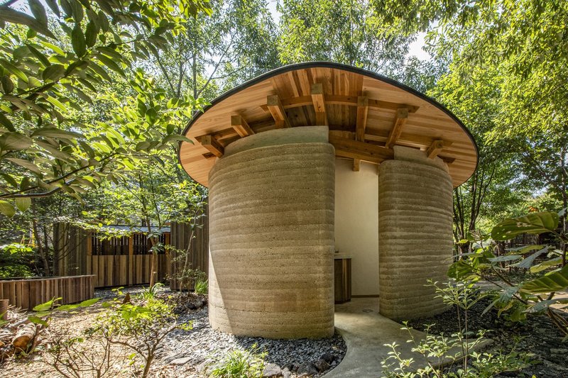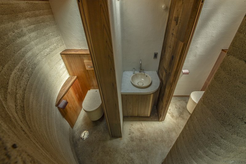 The project utilizes almost entirely recycled materials for construction, including the internal structures and fixtures. Recycled wood chips are used for toilet and washbasin bowls, while the interior walls and floors are made from recycled soil, wood, and glass. The use of traditional Japanese plastering techniques enhances the building's ecological ethos and aesthetic appeal.