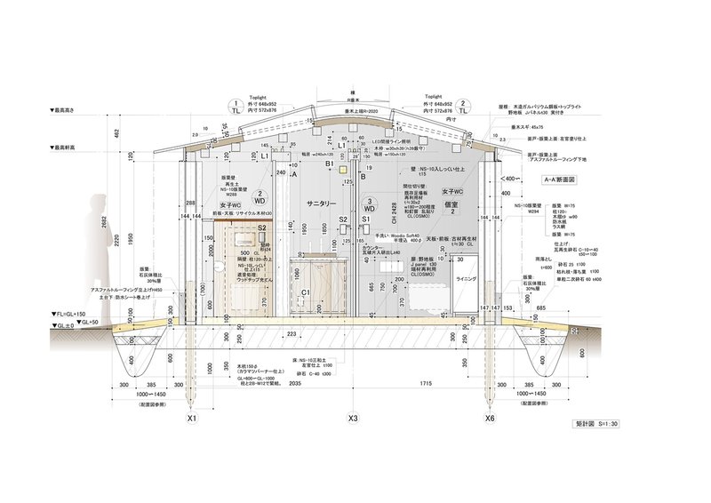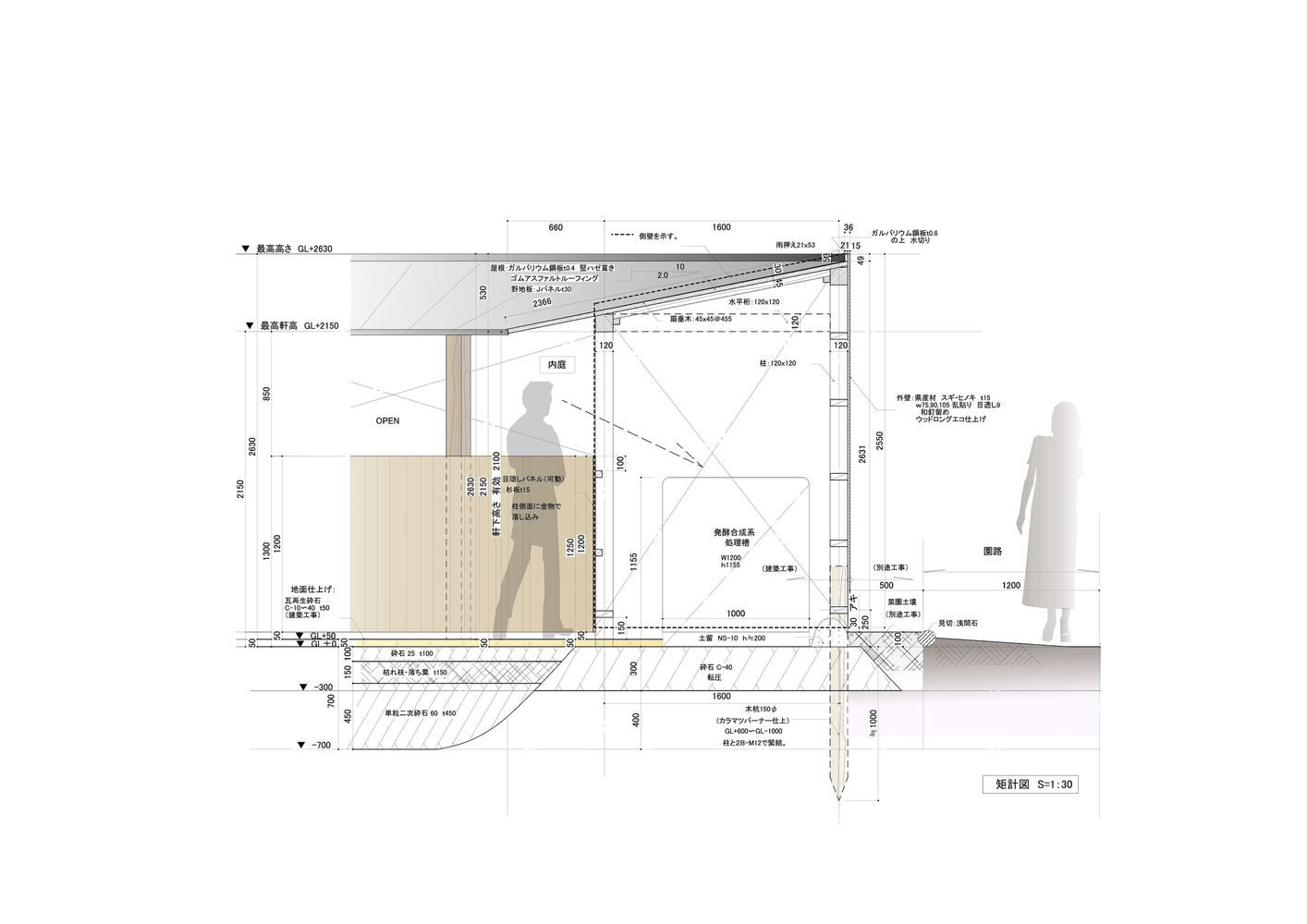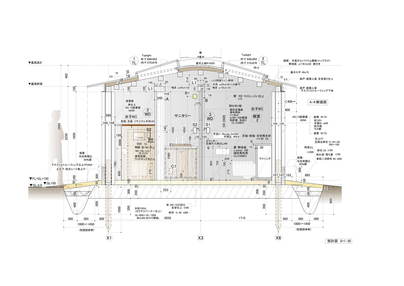 The project utilizes almost entirely recycled materials for construction, including the internal structures and fixtures. Recycled wood chips are used for toilet and washbasin bowls, while the interior walls and floors are made from recycled soil, wood, and glass. The use of traditional Japanese plastering techniques enhances the building's ecological ethos and aesthetic appeal.