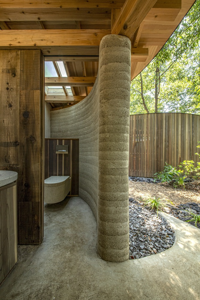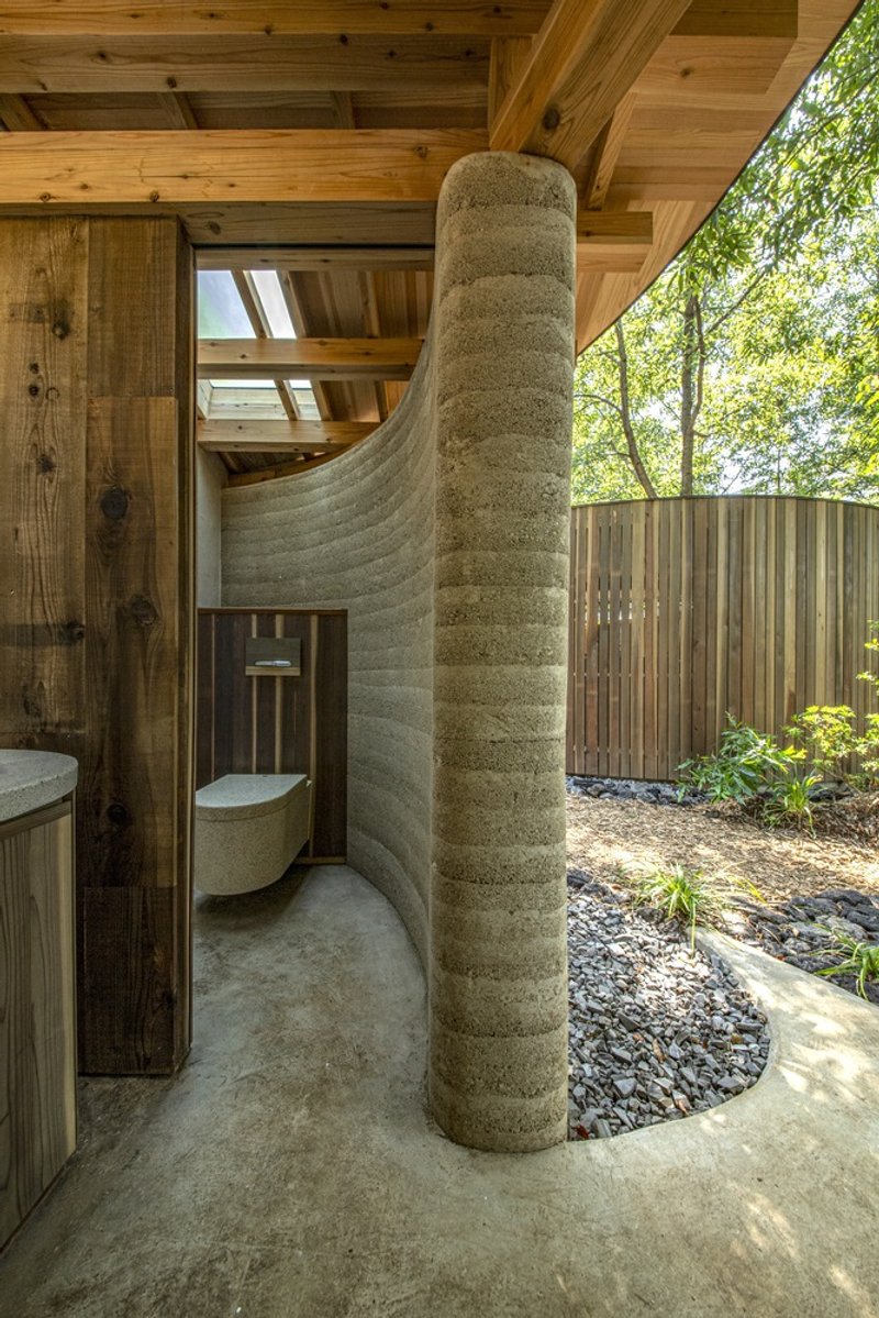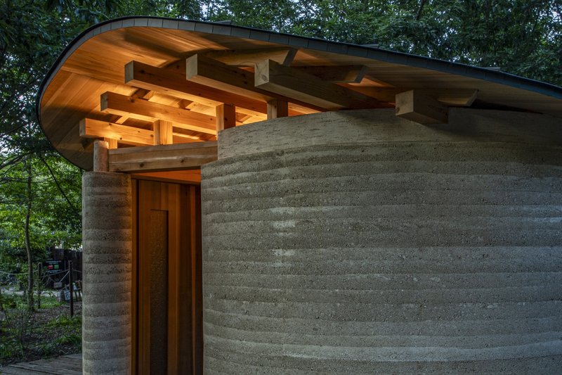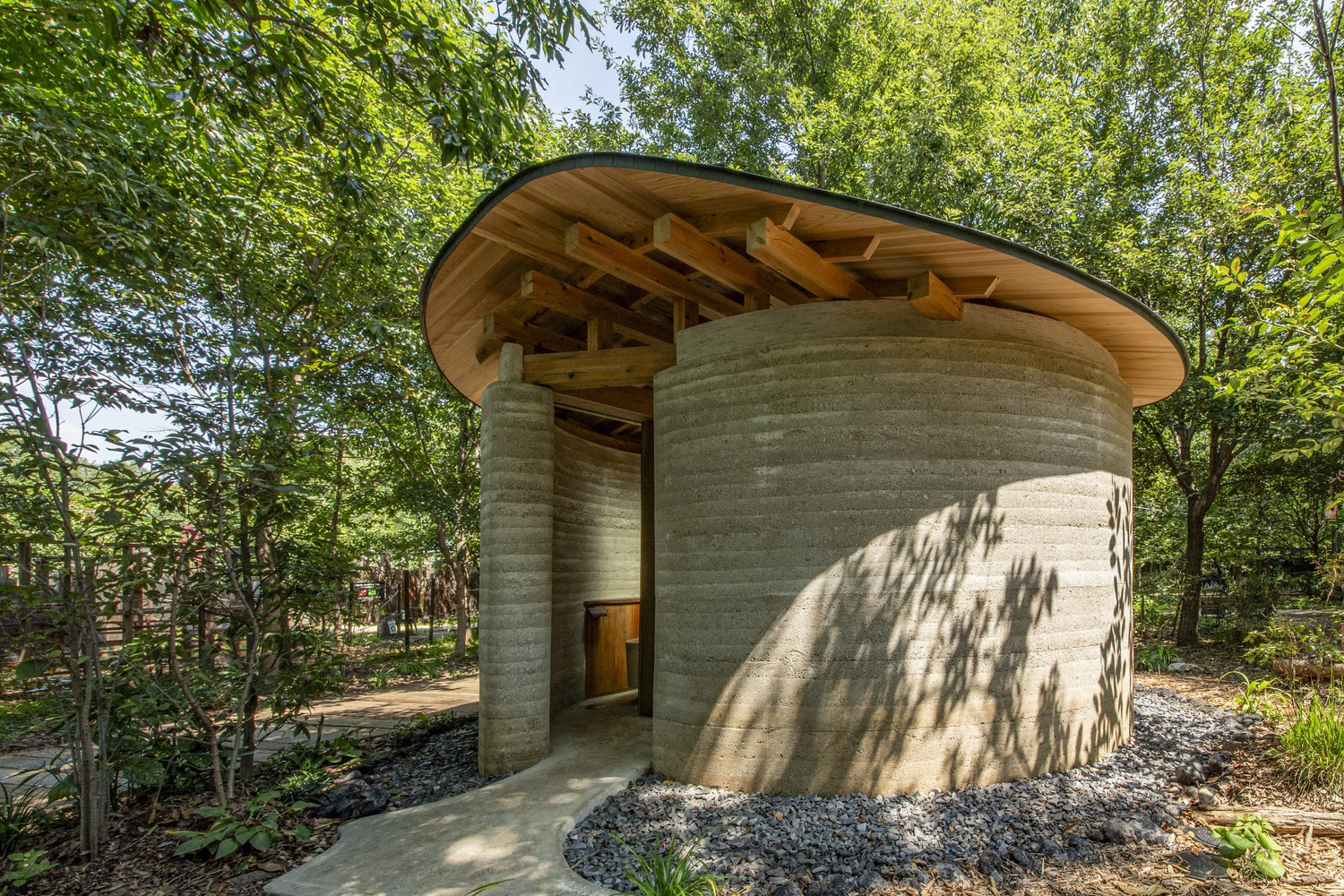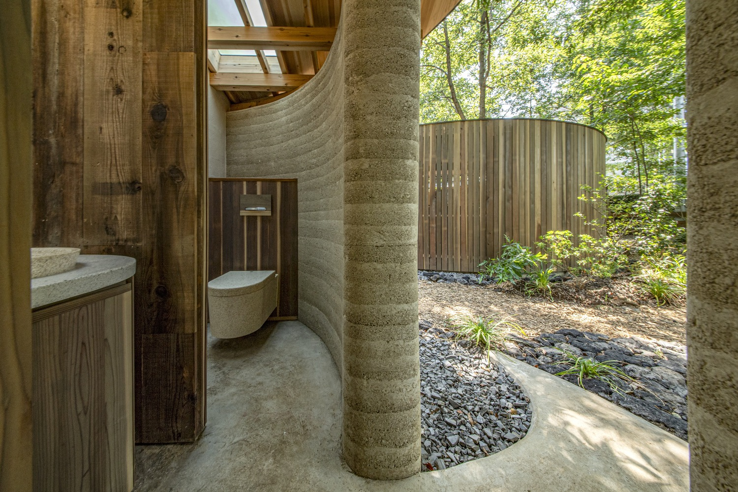 TOILETOWA W.C. embodies the principles of circular economy and regeneration. The project was constructed with minimal environmental impact in mind, utilizing recycled materials and local resources. The building itself is primarily made of a unique rammed earth wall consisting of recycled soil, highlighting the project's commitment to "building from the earth."