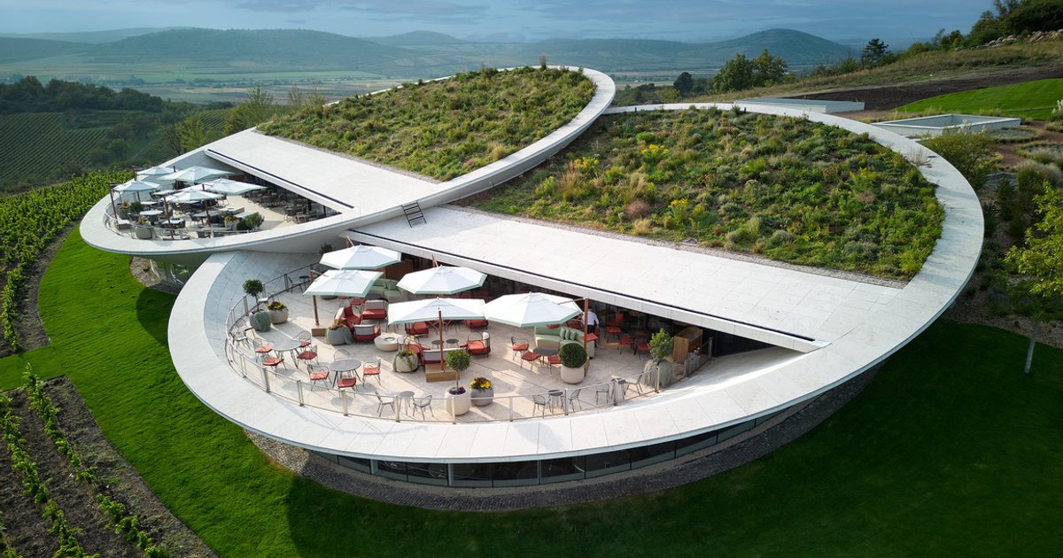 A floating, lens-shaped winery in Tokaj blending modern architecture, underground production, and panoramic hospitality within Hungary’s historic UNESCO wine landscape.