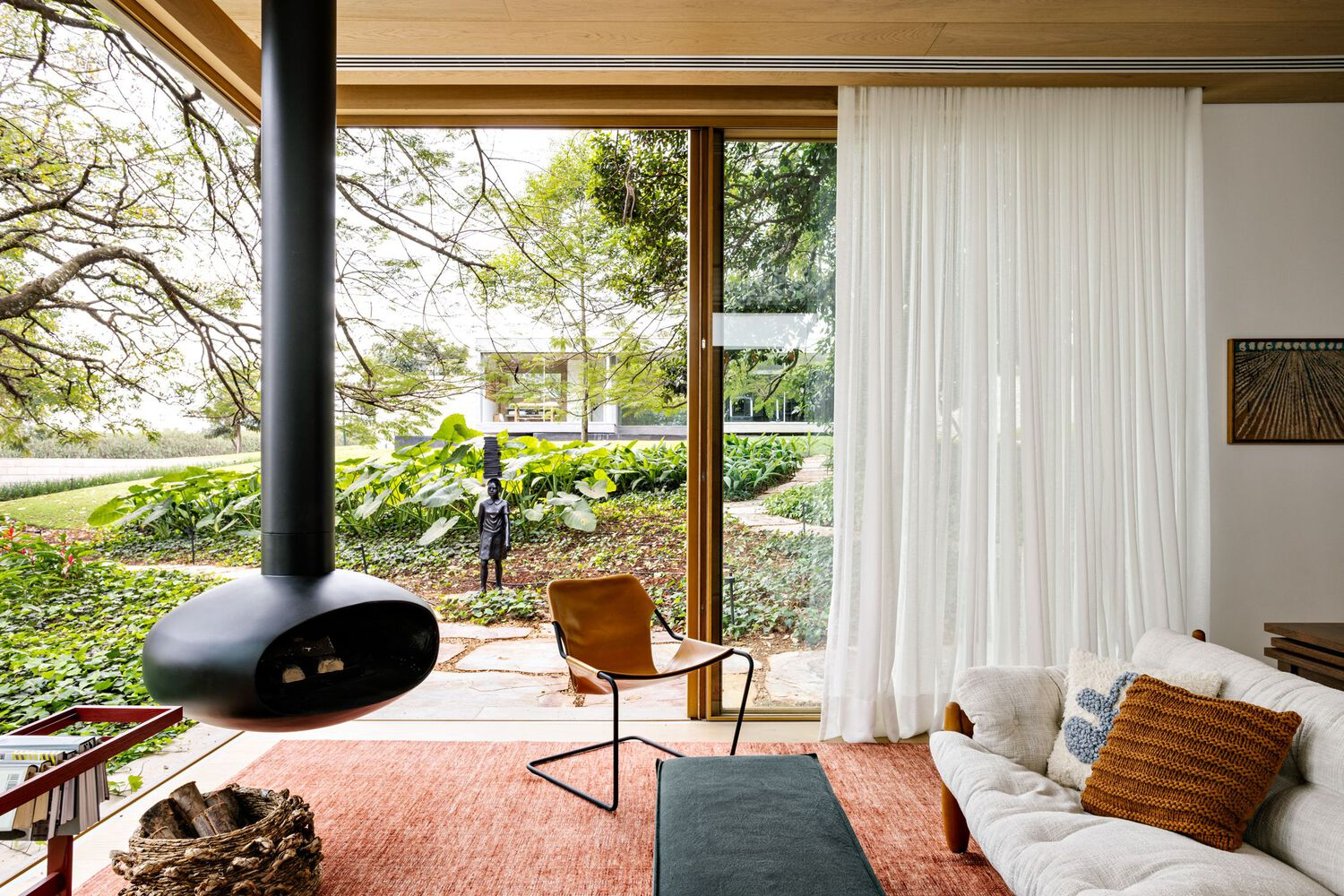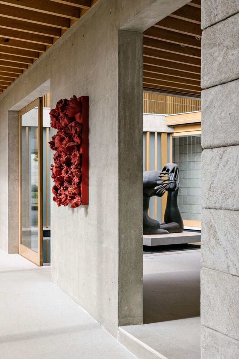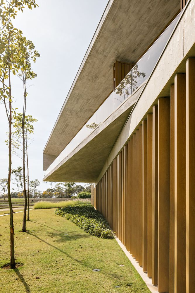 The design emphasizes the continuity between internal and external spaces. Various planes organize the structure and landscape, reinforcing the presence of patios of different sizes. These outdoor areas are adorned with large sculptures, reflecting the client's appreciation for Brazilian art and further blurring the boundaries between the built environment and nature.