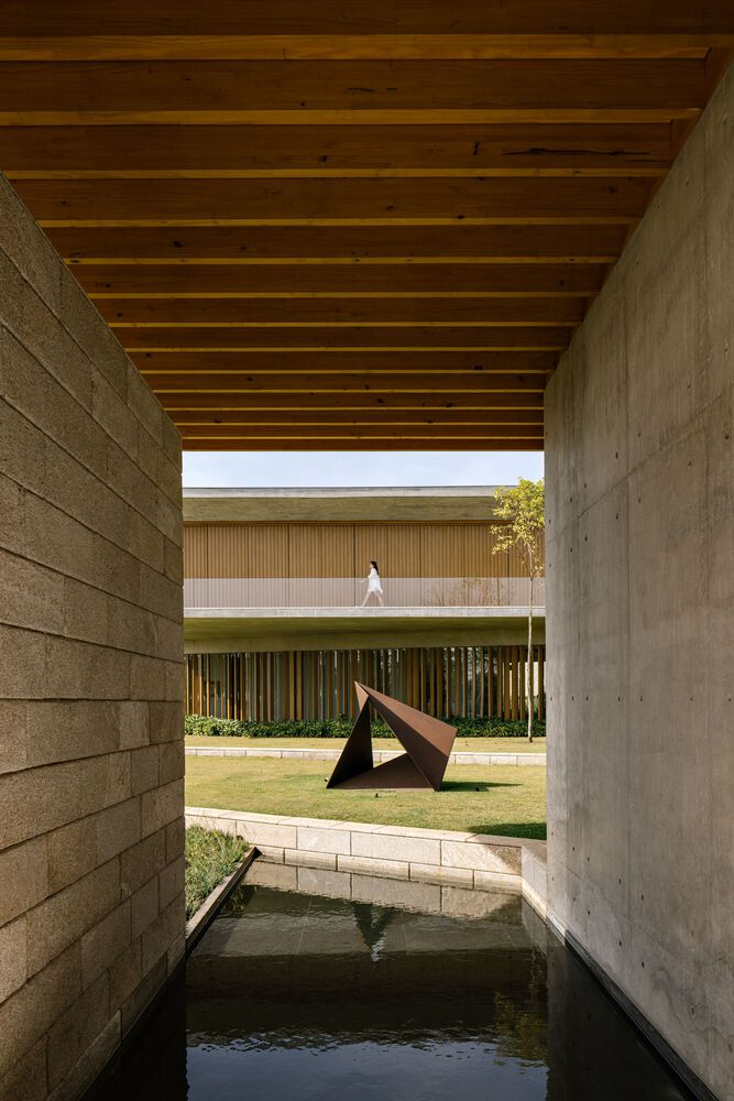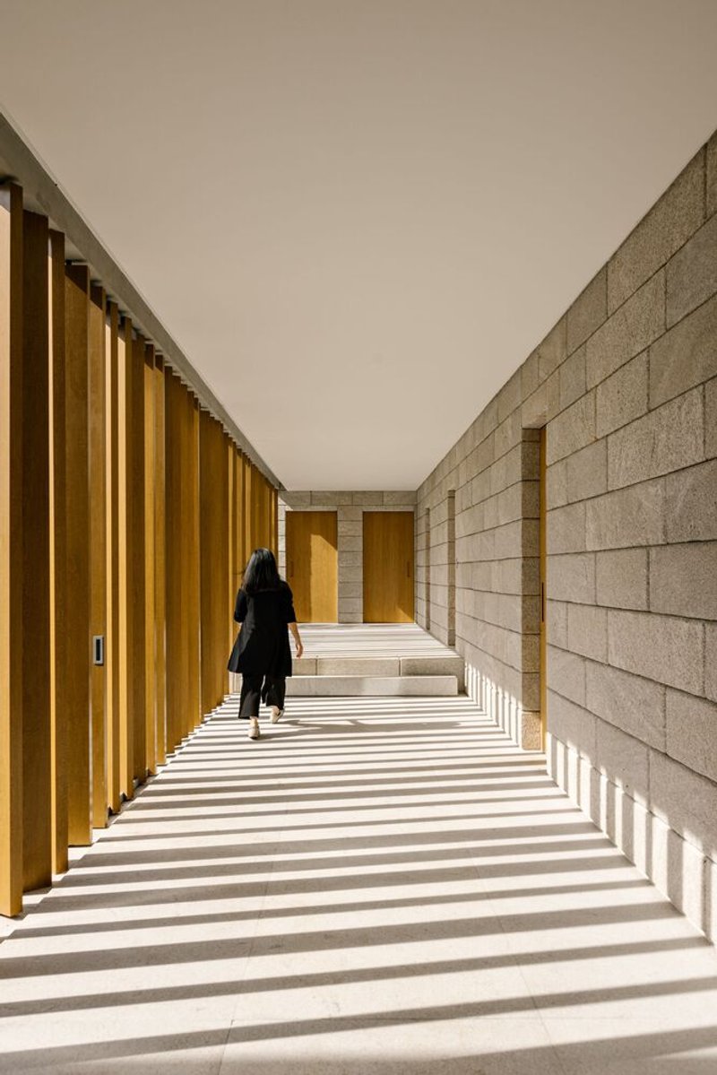 Wood serves as a unifying covering plan, gently separating the concrete and stone elements. This material choice adds warmth and texture to the design, enhancing the tactile experience of the space and further integrating the architecture with its natural context.