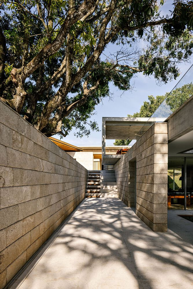 The use of exposed concrete and stone in the construction reinforces the connection to the earth. These materials are carefully arranged to create planes that organize the space and landscape, allowing for natural transitions between different areas of the house.
