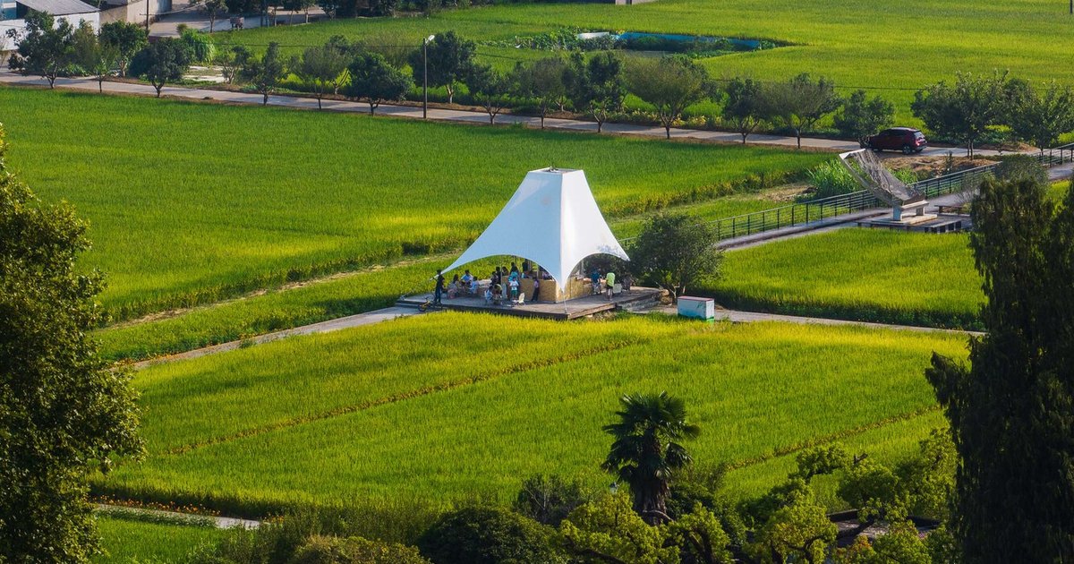 Tower Pavilion in Paddy Fields blends tower, tent, and pavilion forms, creating a community hub, bubble tea shop, and rural cultural landmark.