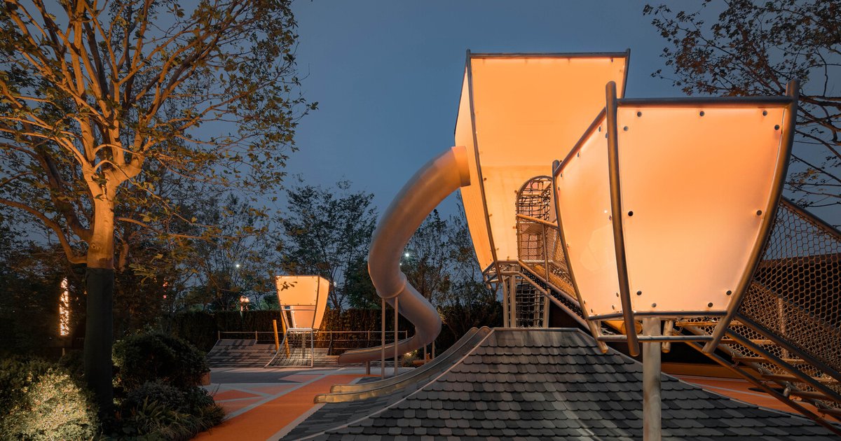The project progresses from historical culture to folkloric symbols and everyday scenes, capturing the essence of “harmony, joy, and the warm glow of countless household lights.” The Neo-Chinese courtyard architecture is extended into the playground, integrating sloped tiled roofs, climbing nets, and interactive tunnels, while rejecting conventional toy-stacking designs.