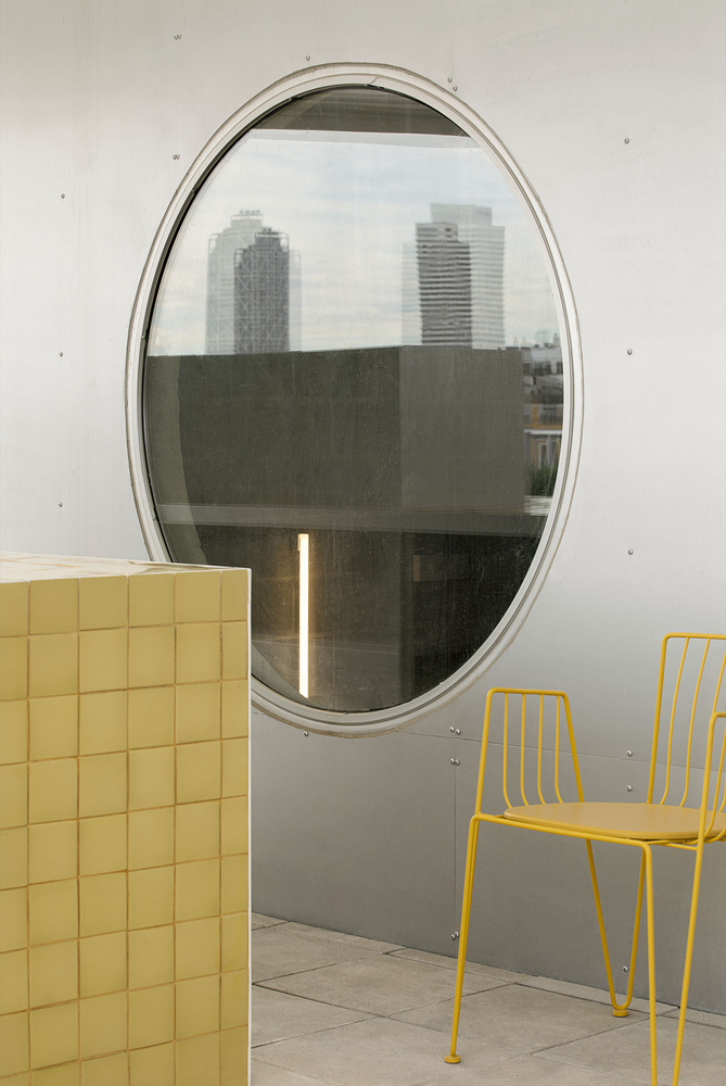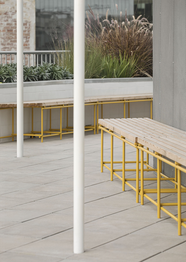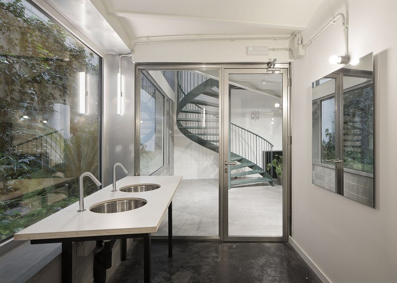 The renovation emphasizes steel and concrete, materials that maintain the authenticity of the building’s industrial heritage. Each floor is characterized by a unique shade of green, creating a subtle gradation from dark tones at street level to lighter hues toward the rooftop, reinforcing a sense of upward movement.