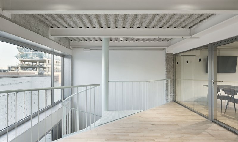 - Placement of meeting rooms in mezzanine areas, giving them a symbolic and highly visible role within the workspace.
