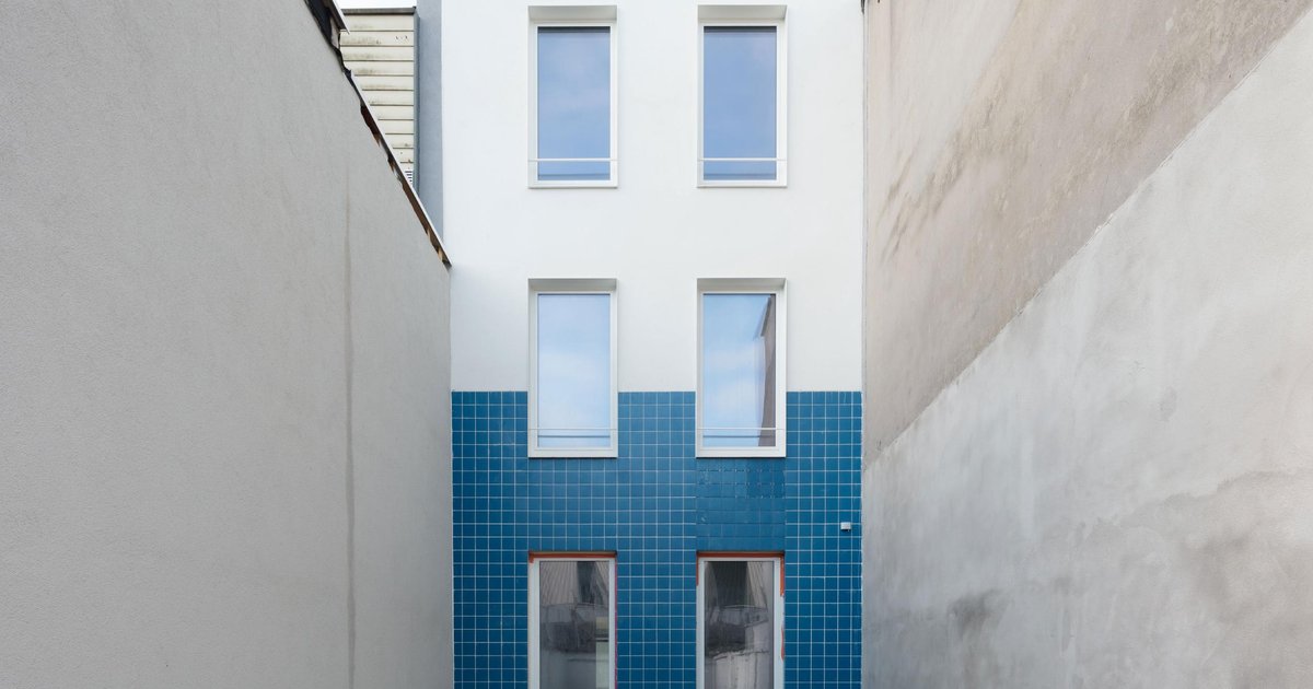 The front facade of A Simple House features a high plinth in blue tiling, giving it an idiosyncratic appearance while still adhering to the horizontal articulations of its neighbouring houses. This clear-cut image was replicated at the rear of the house, creating two identical facades that emphasize symmetry in the plan and the apparent simplicity of the house.