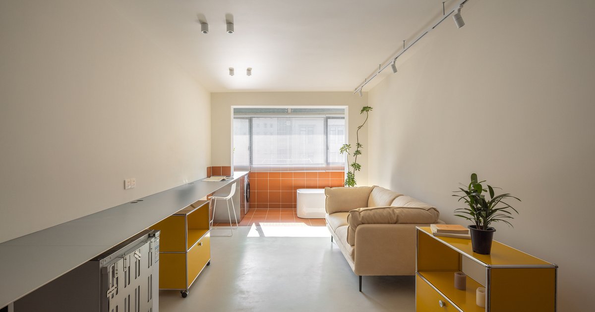 The introduction of a terracotta brick curved wall serves as both a spatial separator and a unifying element, reorganizing the interior from fragmented spaces into a cohesive whole. This feature not only enhances the apartment's aesthetic appeal but also improves its functionality, offering designated areas for storage, relaxation, and social interaction.