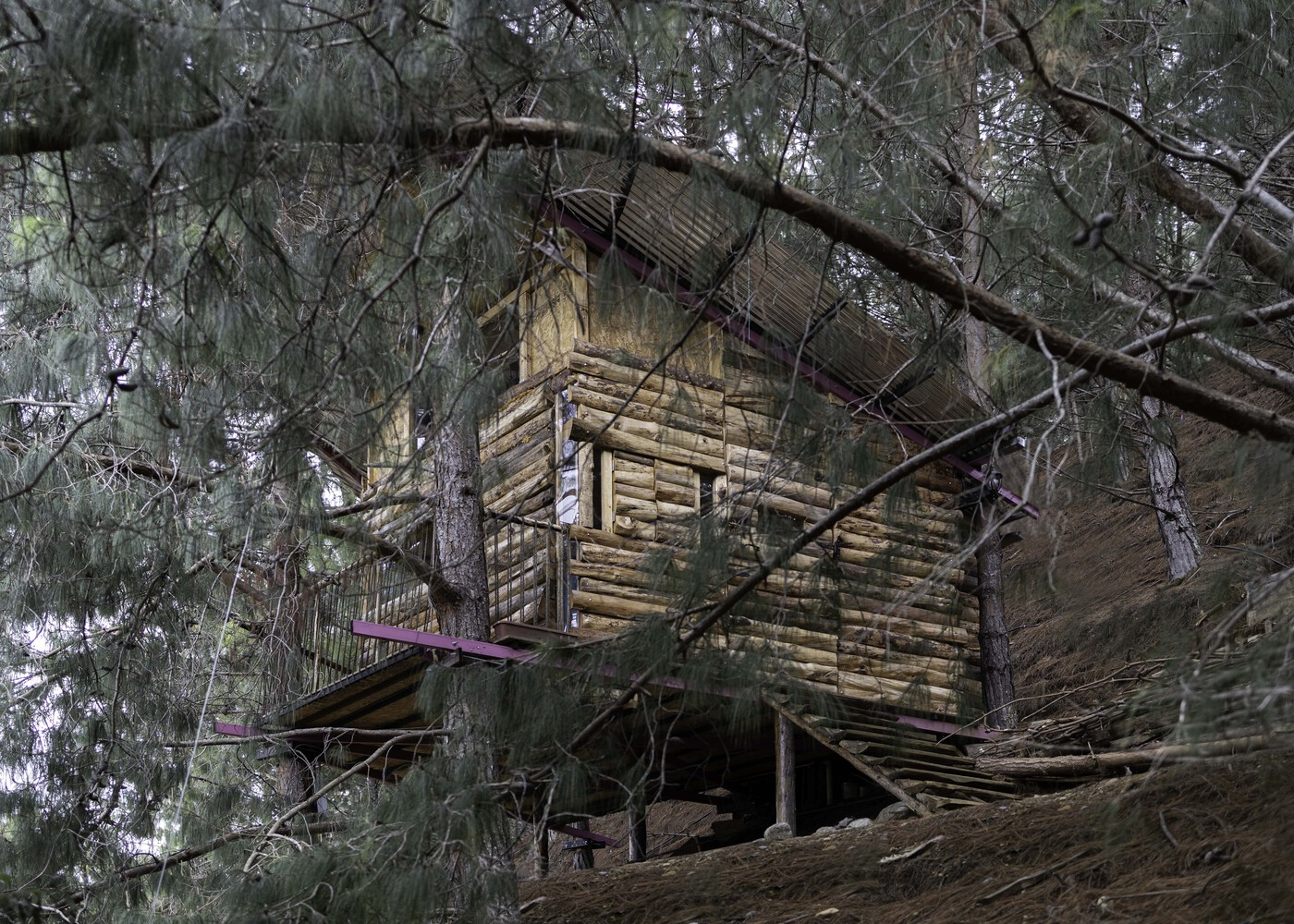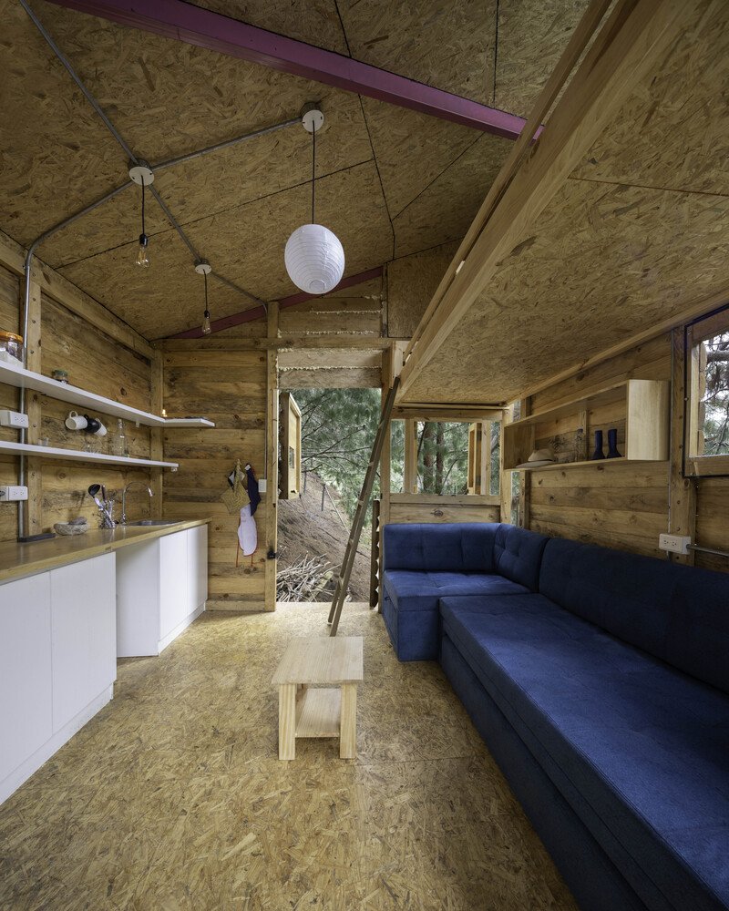 This off-grid treehouse embodies the concept of circular architecture, adapting to the slow growth of the trees while withstanding harsh weather conditions. Over time, it continues to age gracefully alongside the towering pines, a testament to the resilience of sustainable design.