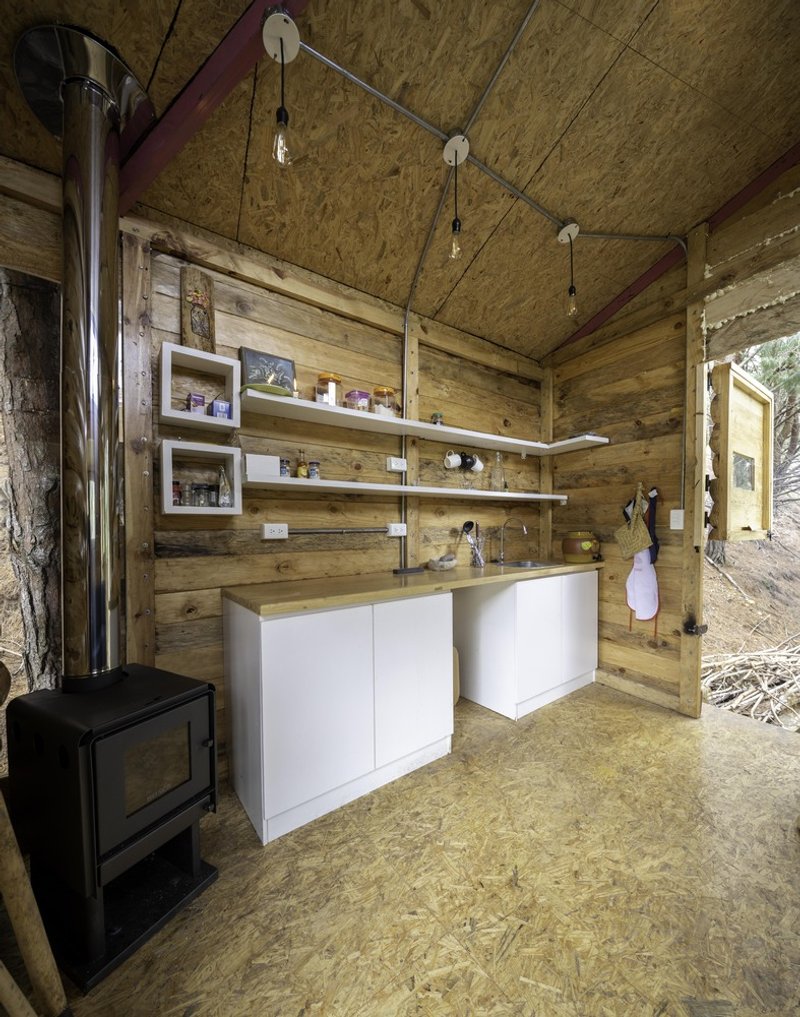 - Main Living Area: Constructed using locally sourced pine masonry, this space includes a kitchen counter, wood-burning stove, sofa bed, and bunk bed positioned within the high ceiling space. Large windows allow natural light to flood the interior while framing spectacular forest views.