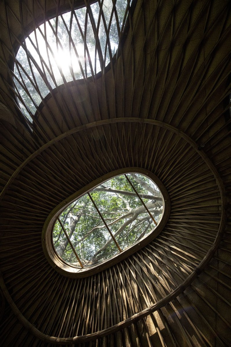 The treehouse is ingeniously designed as an oversized bamboo basket, where the flooring seamlessly transitions into sloping walls, creating a cozy yet open interior. The lightweight bamboo roof extends gracefully around the three trees, while strategically placed skylights invite natural sunlight to filter through, enhancing the airy ambiance.